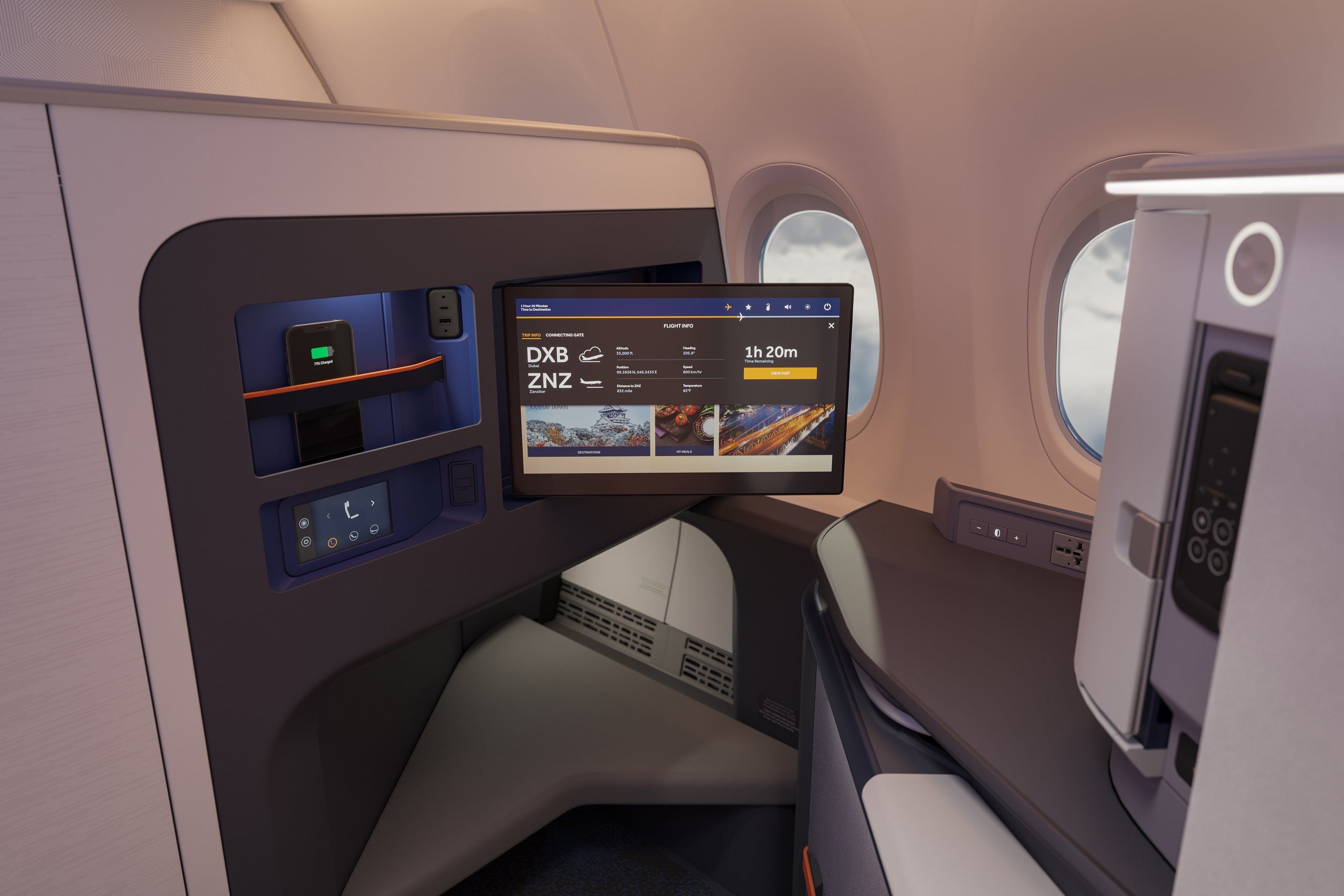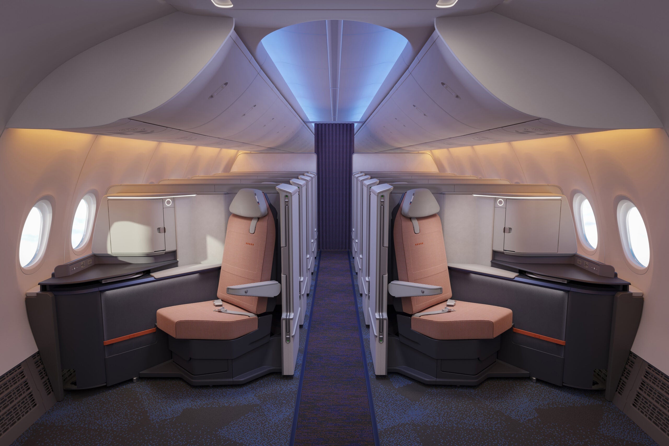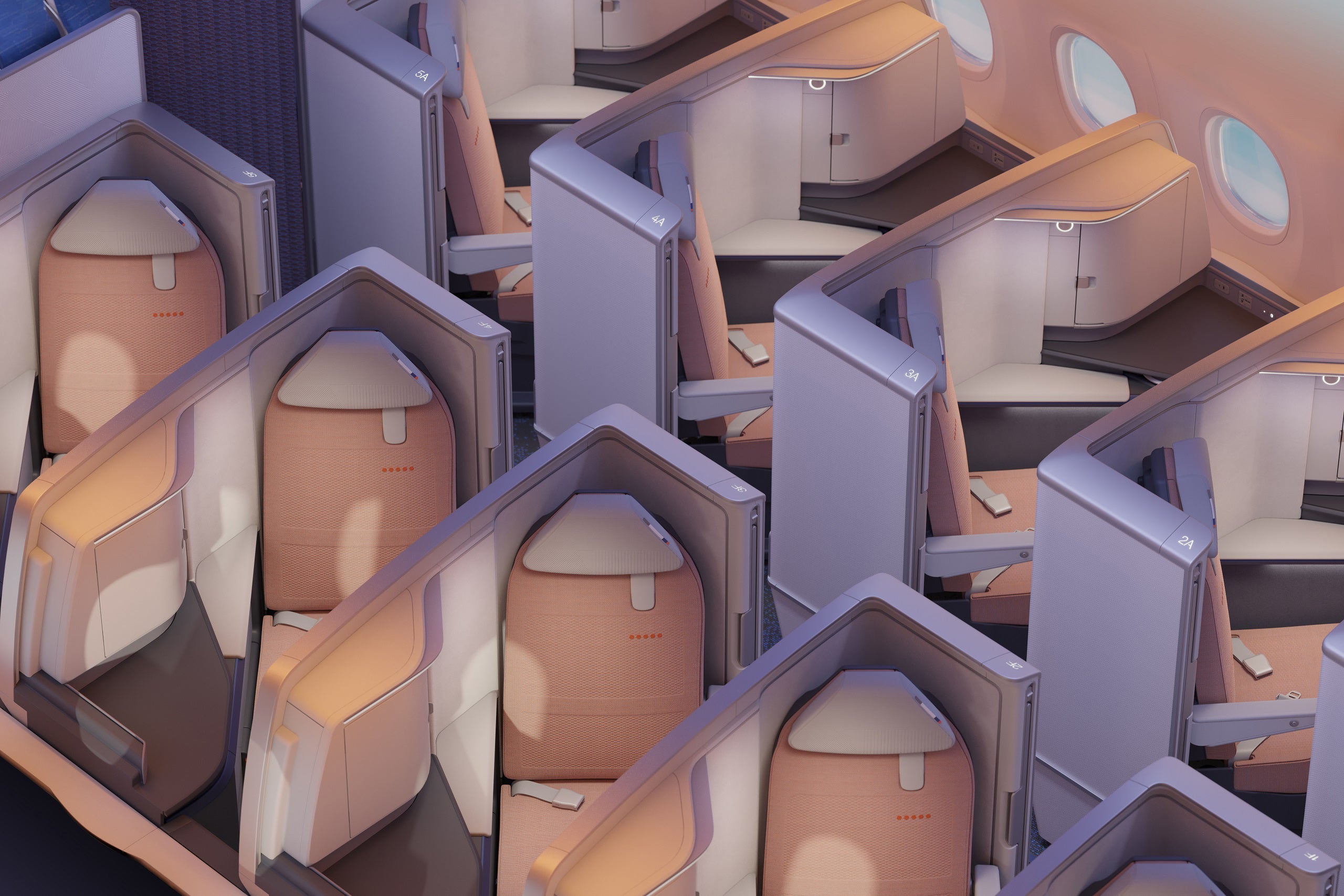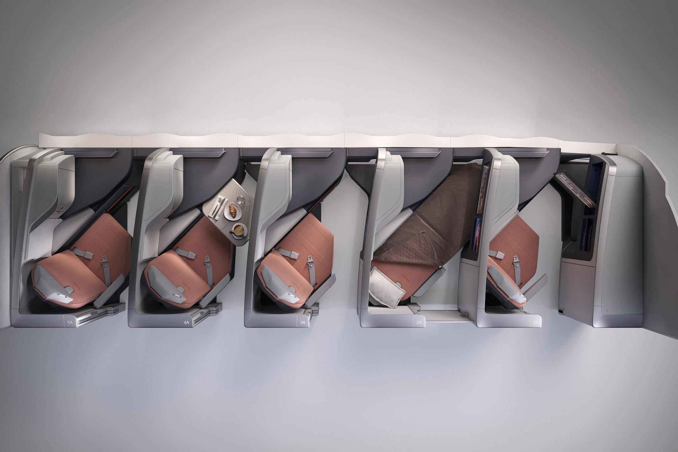 Other bells and whistles include electronically dimmable windows, large storage compartments, ambient mood lighting and 17-inch 4K entertainment screens with wireless Bluetooth connectivity.