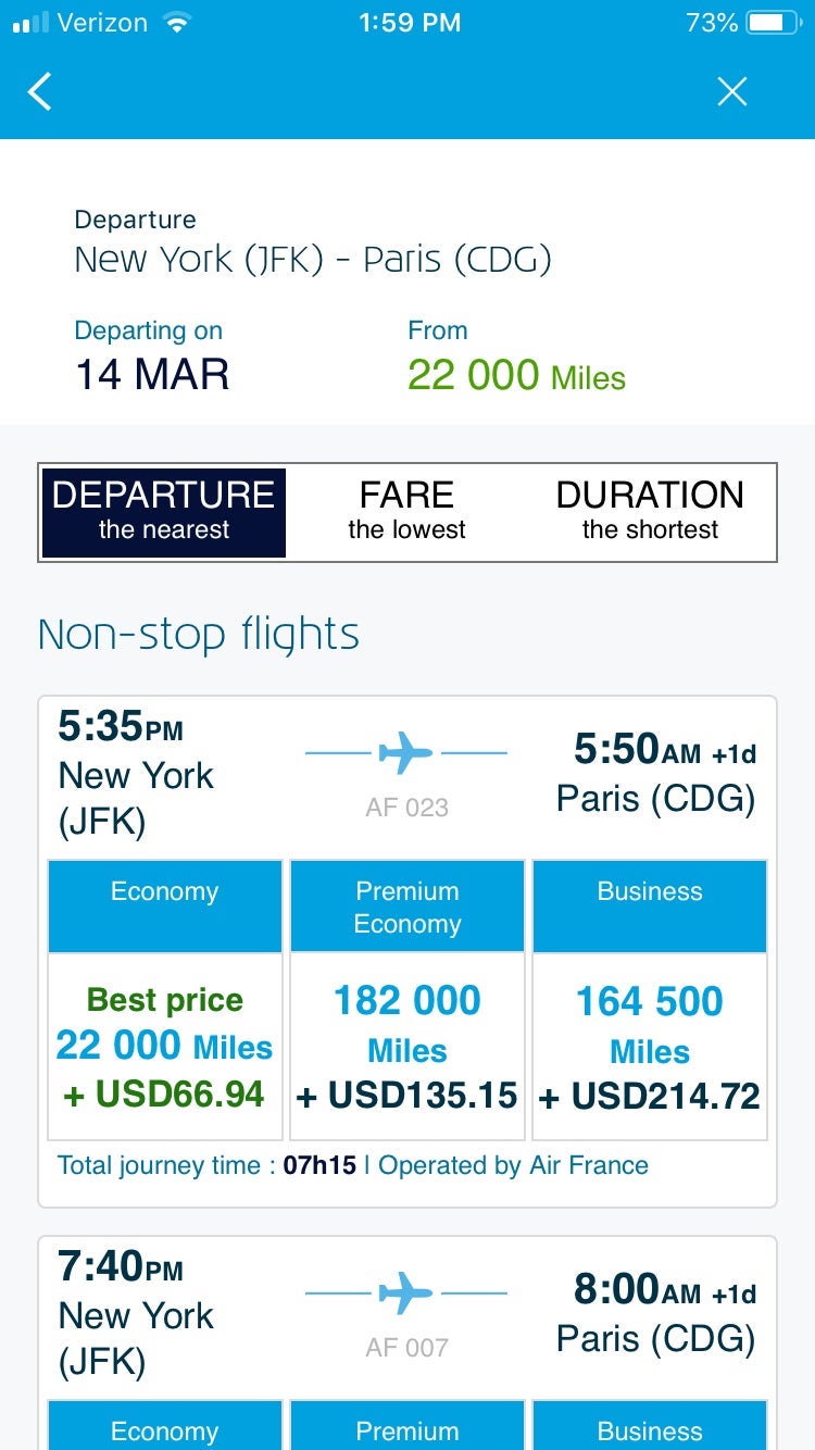 In the meantime, it appears that award searches through mobile apps are working without problems. TPG Senior Editor Nick Ewen was able to pull up results with a zero mileage balance in his Flying Blue account through both the Air France app: