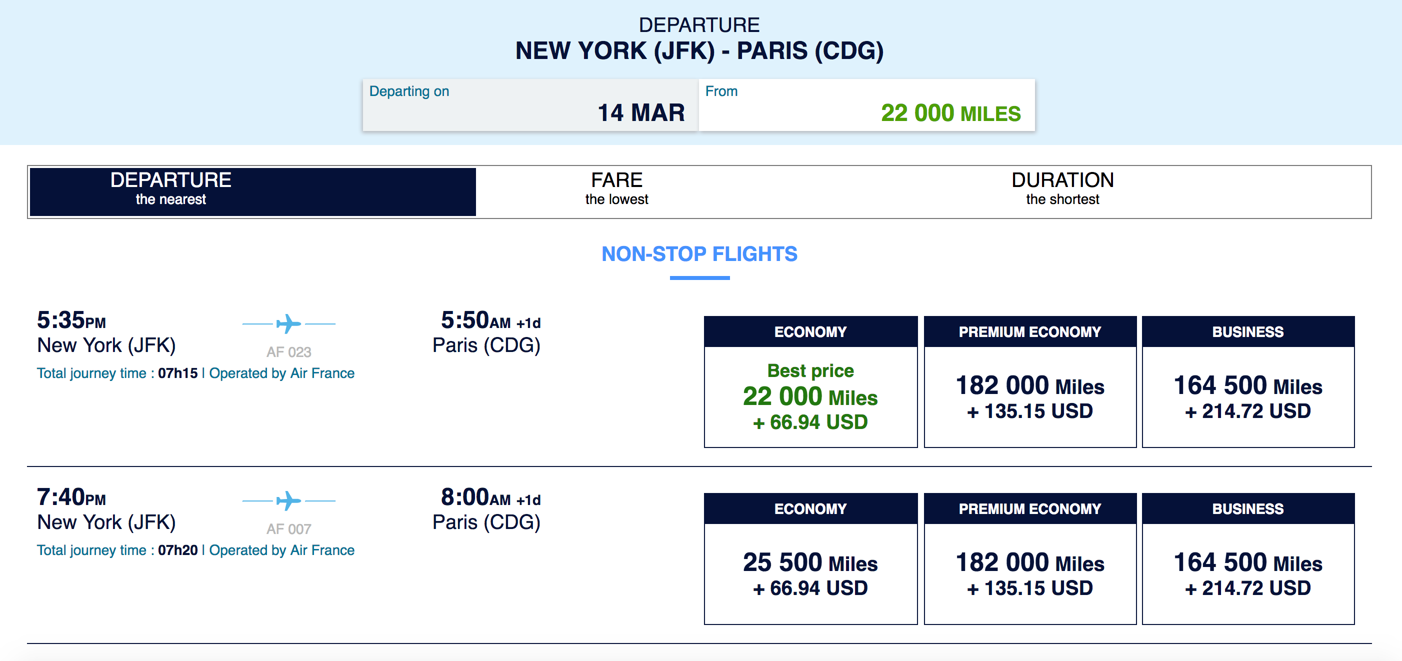 (Side note: The Air France app was, for some reason, displaying the results for the day prior to the one Nick searched. In both of the above screen captures, he had used Thursday Mar. 14, but Air France returned results for Mar. 13.)