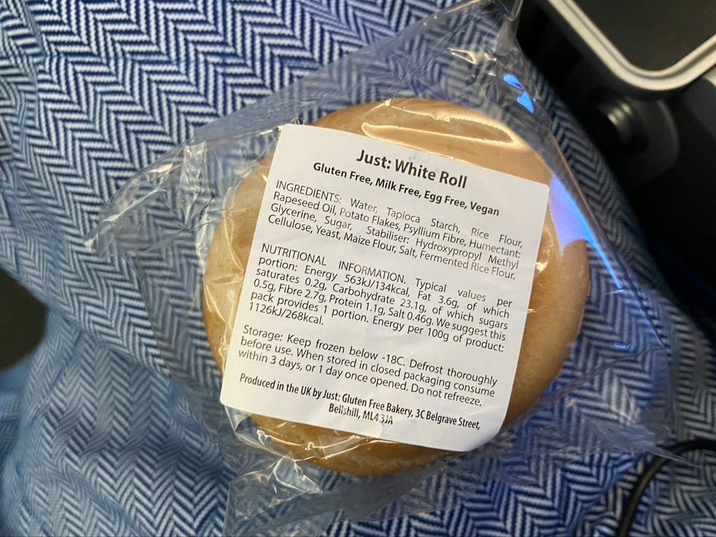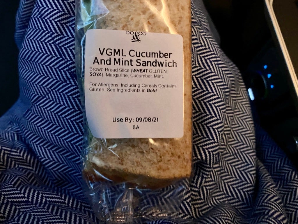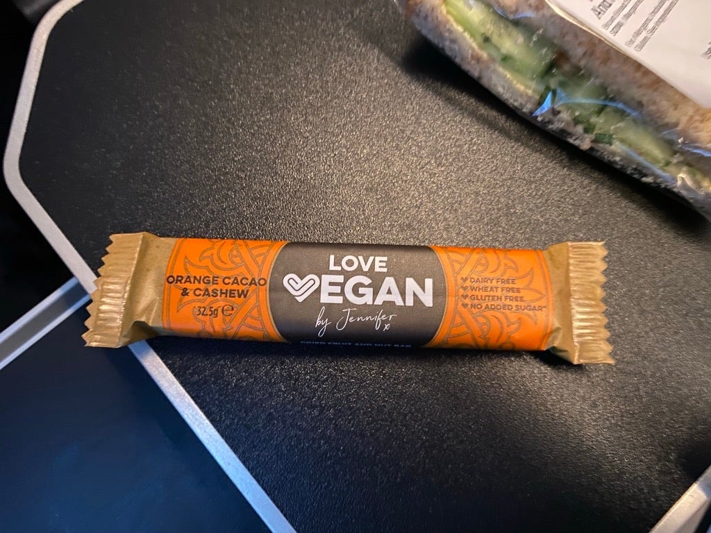 Some five hours later, the vegan breakfast meal was once again unsuitable for my dietary restrictions. Although I could not enjoy either the vegan cucumber and mint sandwich or the croissants, I did eat the orange, cacao and cashew granola bar provided