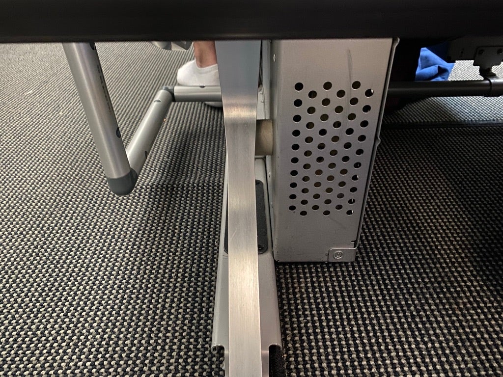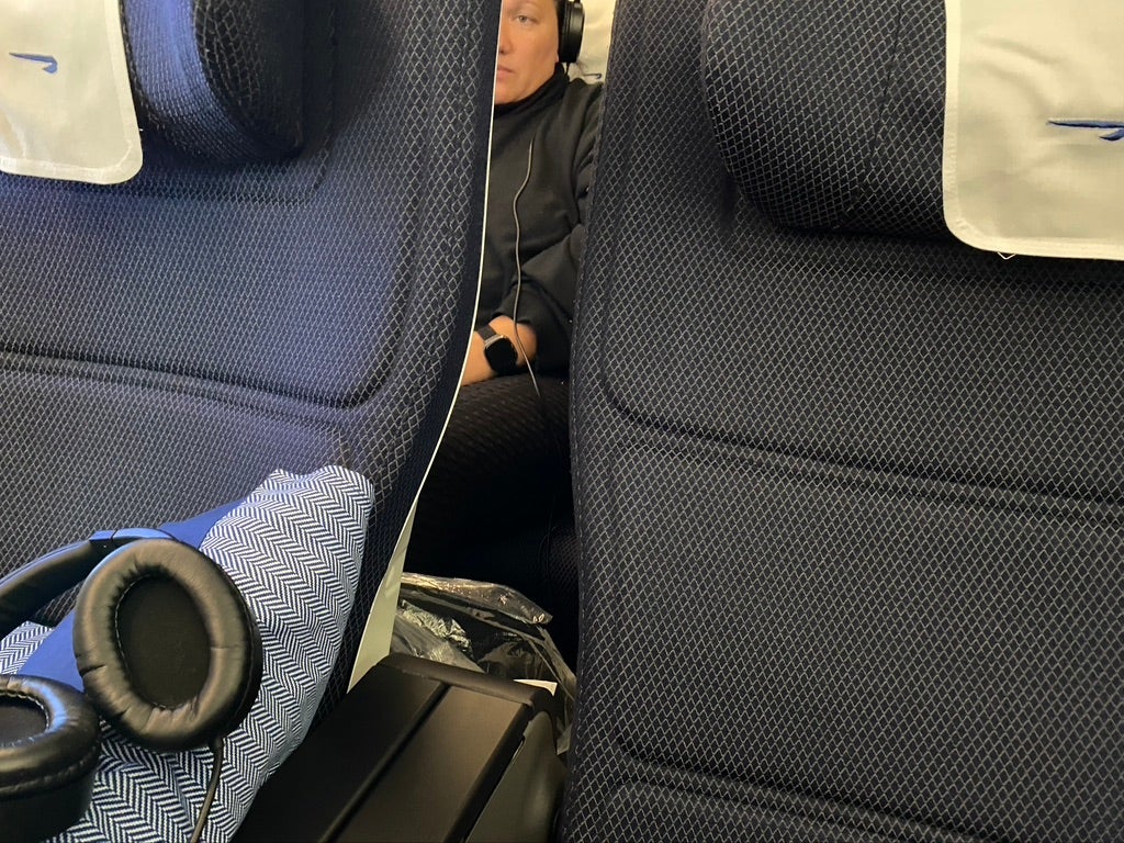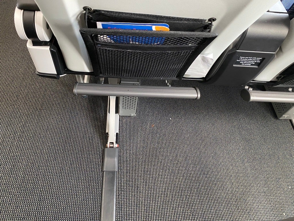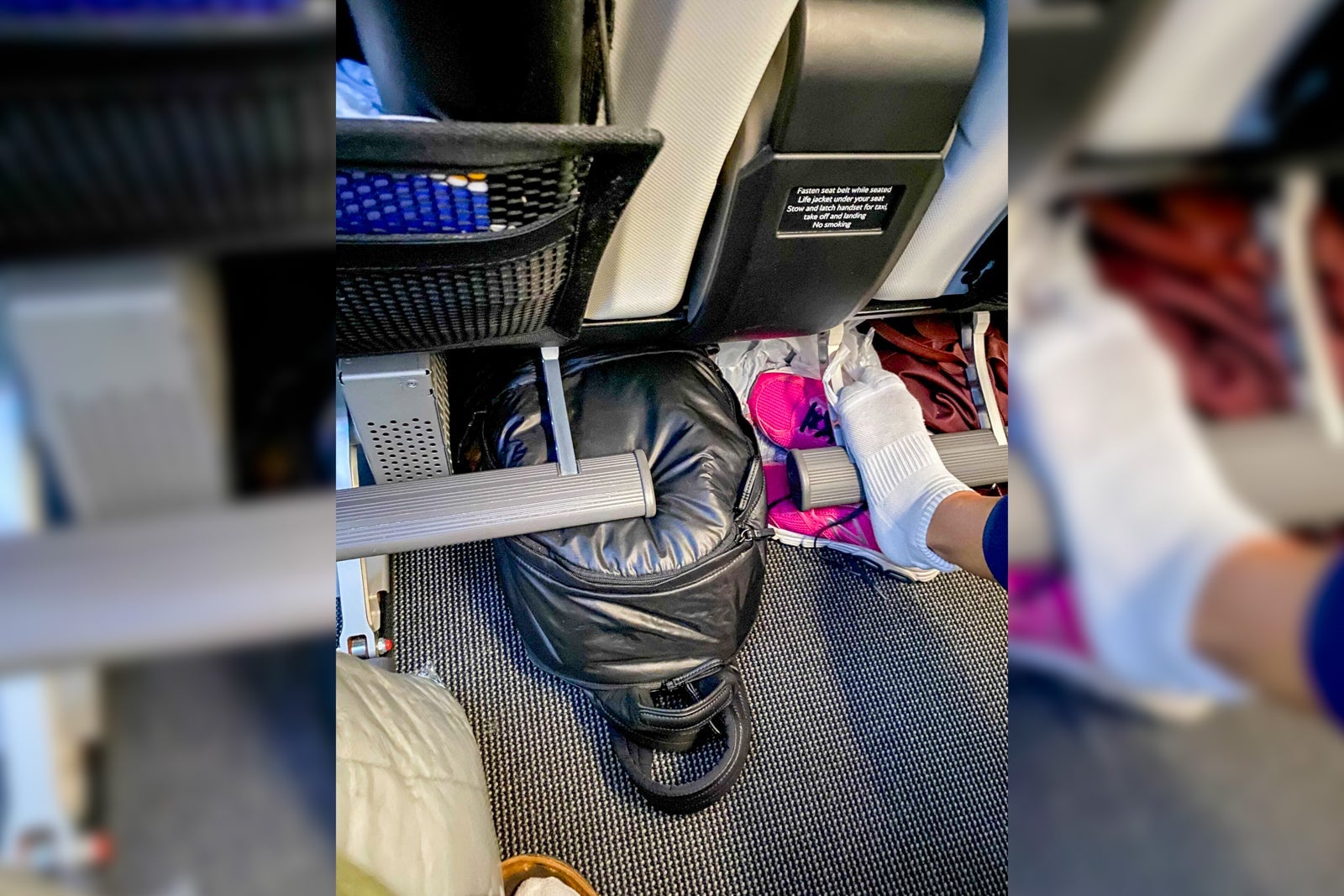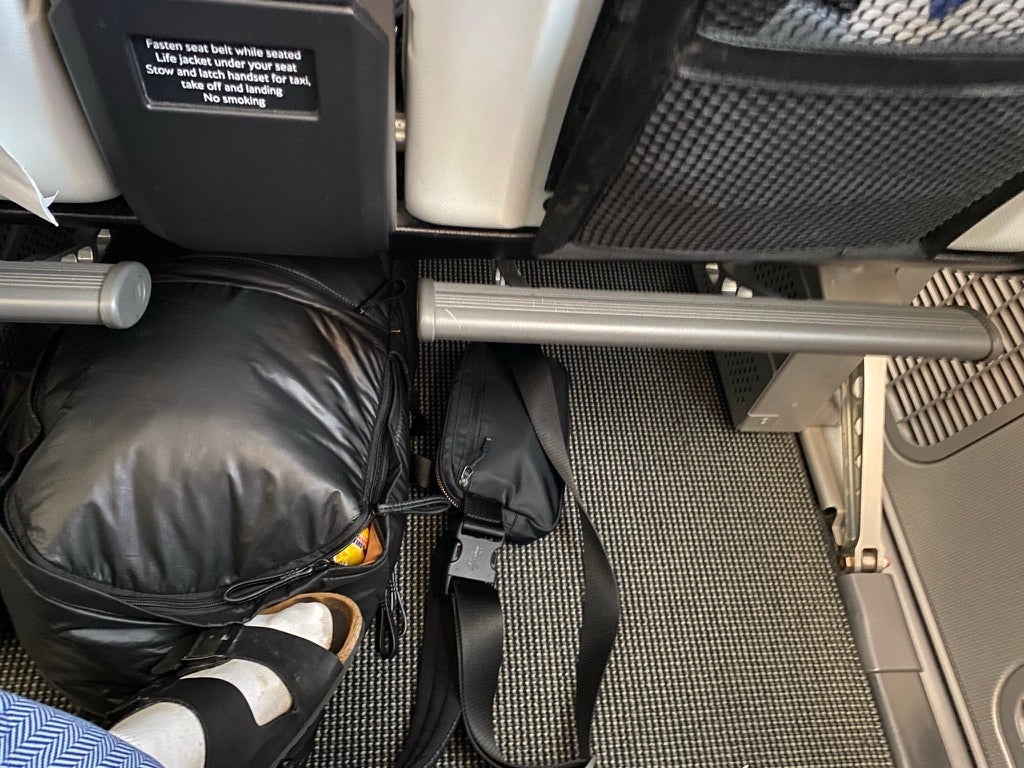 The underseat storage, as TPG previously noted, is rather limited due to the placement of equipment boxes. Both seats in front of us had equipment boxes, forcing us to squeeze our bags together in between. This was also the case for the seats in the middle section.