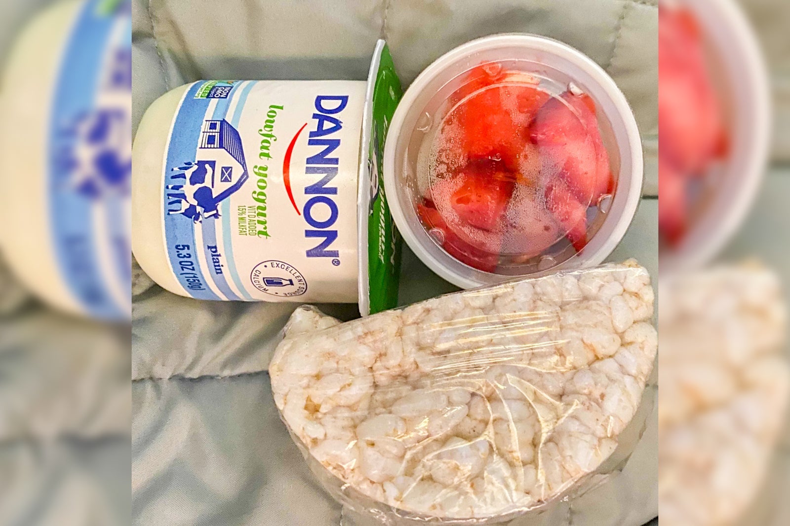 The next morning, Aug. 2, passengers were offered a croissant for breakfast, with either cheese or turkey and cheese. For me, the gluten-free meal was yogurt, fruit and another rice cake. I obviously didn't eat the yogurt and the rice cake was incredibly soft, but I was a bit hangry at that point.