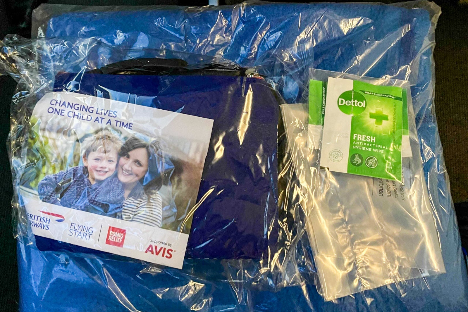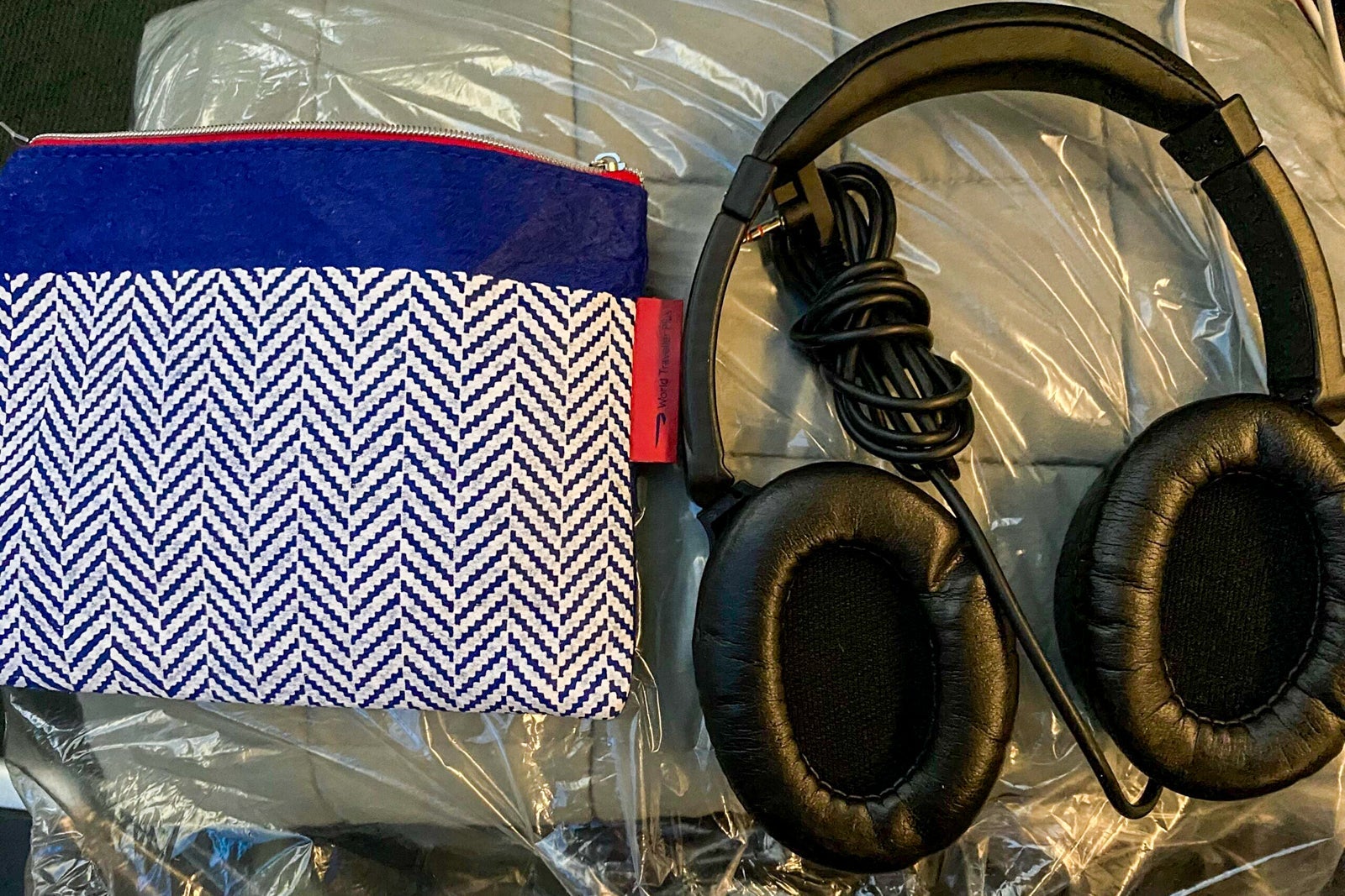 With the exception of the blanket, the amenity kit was the same on both of my flights. Upon boarding my flight to London, all passengers received sanitizing wipes, plastic-wrapped noise-canceling headphones, a blue blanket and a pillow, in addition to a basic amenity kit.