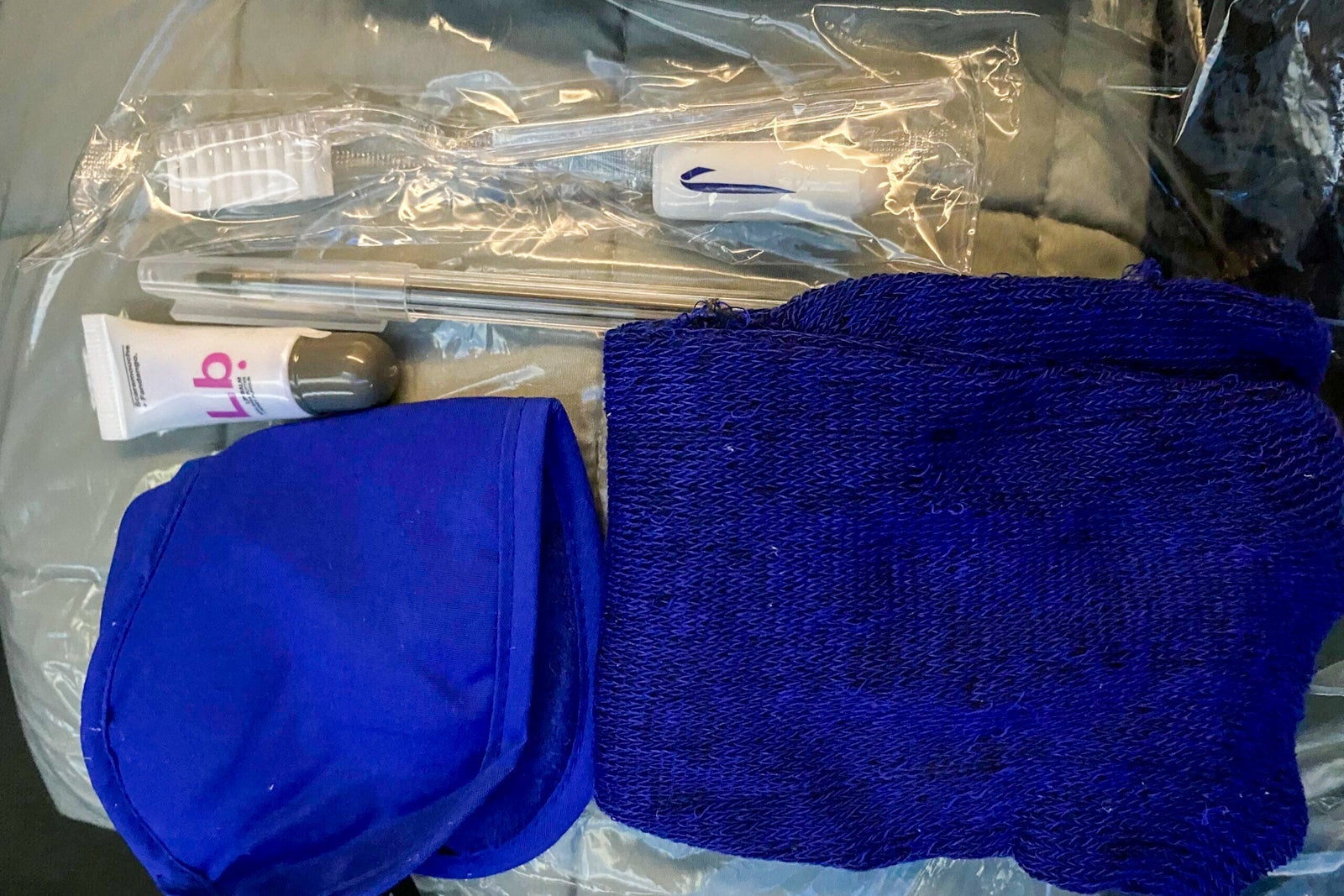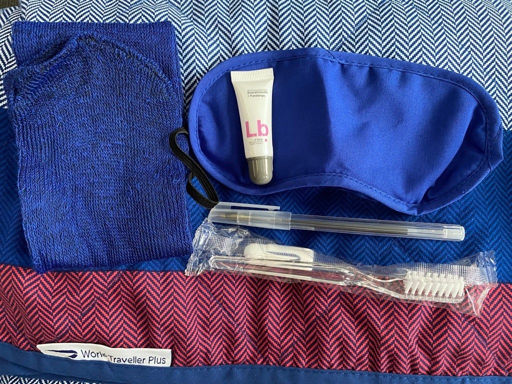 The amenity kit featured an eye mask for sleeping, lip balm, socks, a pen, a toothbrush and toothpaste.