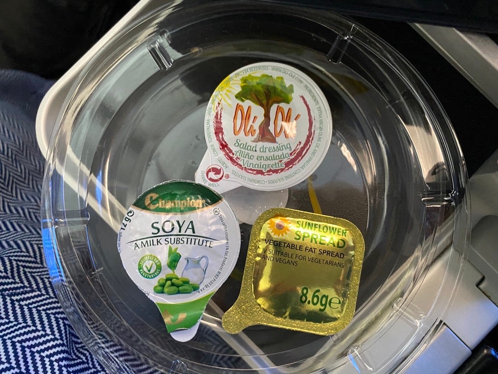 I have to give major props to BA for the availability of vegan condiments, though they didn't have enough on my flight. Although soy milk, vegan salad dressing and vegan butter were provided on the flight back, they ran out of soy milk, so I gave mine to the woman sitting behind me, as the three of us all coincidentally had ordered vegan meals. This wasn't a big deal to me since I hadn't planned on using the milk, but would have been annoying otherwise.