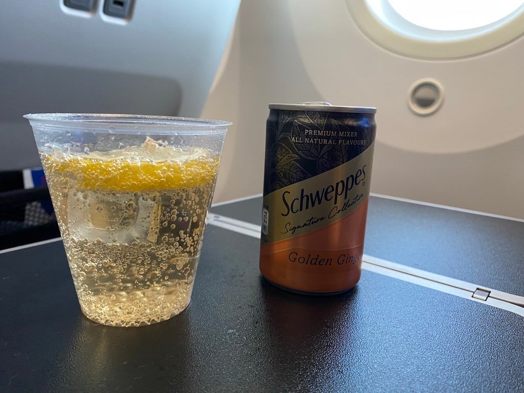 The normal beverage options were offered on each flight, including soft drinks and alcohol. I chose ginger ale, and the lemon with ice was a nice touch.