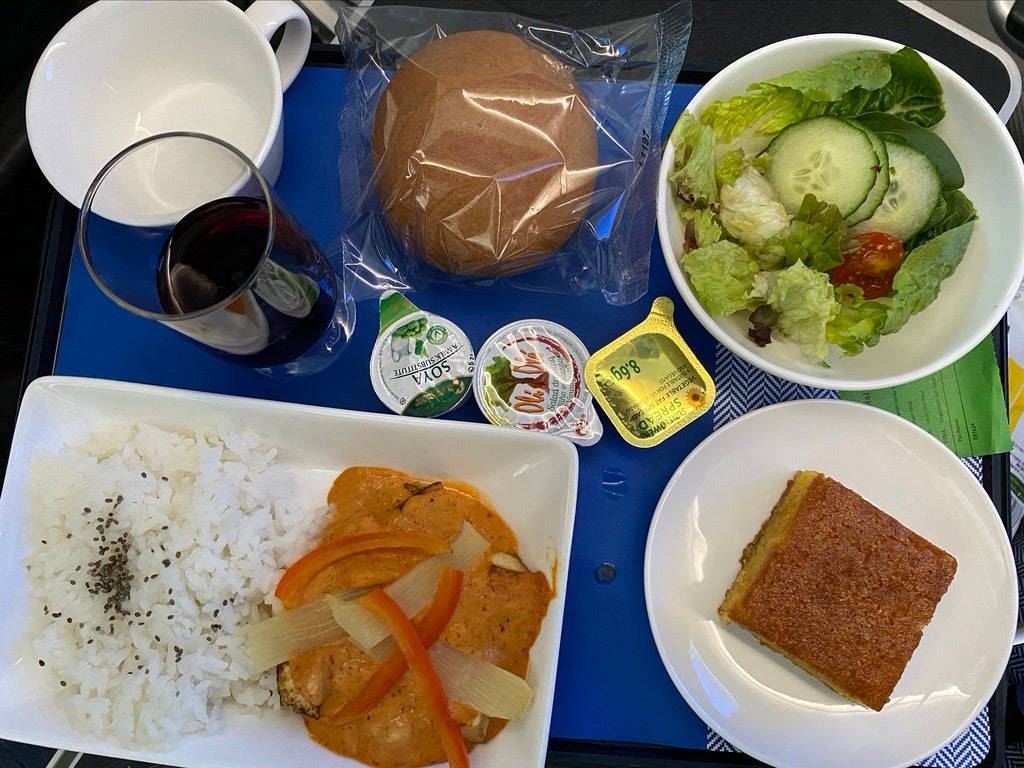 For my flight back to the U.S. on Aug. 8, I requested a vegan meal so I could compare it to the gluten-free option. I am happy to say I had much better luck. While those without food intolerances had a choice between a chicken and leek pie or a veggie pie, those who selected the vegan option received tofu and curry that was actually pretty good. The salad was wilted and the lettuce quite brown.