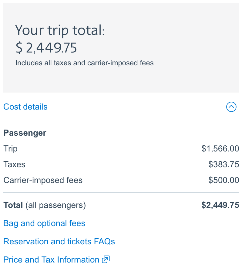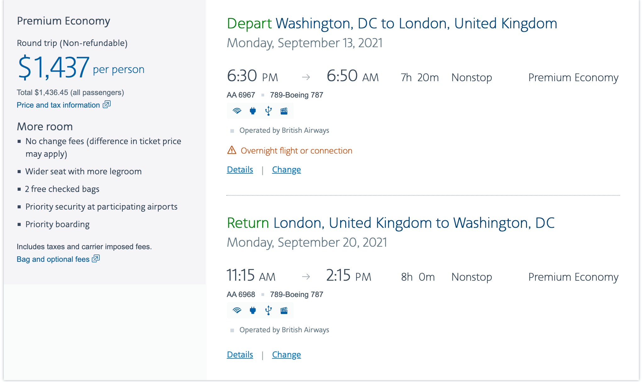 I booked a very last minute ticket issued through AA for a round-trip flight from Dulles International Airport (IAD) to London's Heathrow (LHR) on BA for nearly $2,500. That's a lot of cash, but keep in mind that this was booked late in order for us to cover the reopening of the U.K. to EU and U.S. citizens. If you book in advance, you could find a nonstop BA flight on the same route for September for around $1,400. We've occasionally seen even better deals than that.