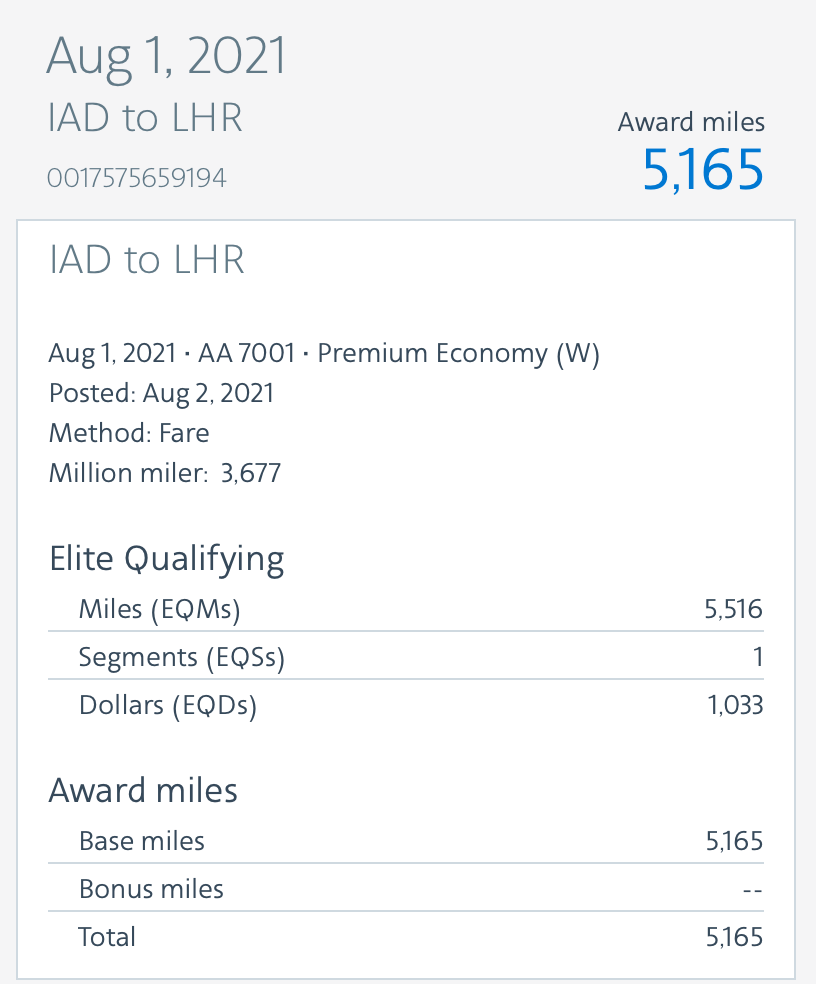 Credited to AAdvantage, my BA-marketed flight earned me 5,165 miles.