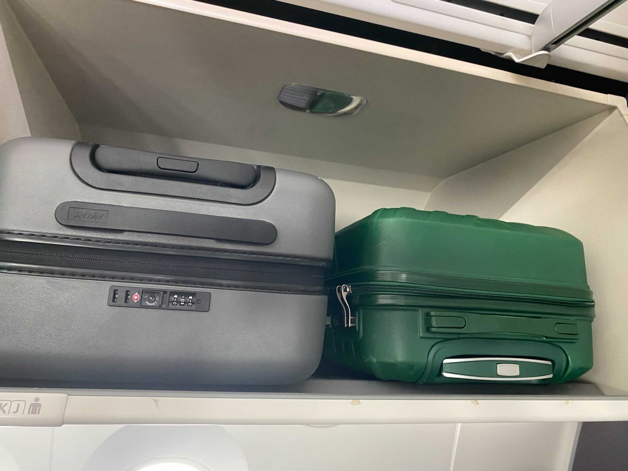 Overhead bin storage was limited for this row as well, since only my suitcase would fit, compared to the standard-sized bins, pictured below.