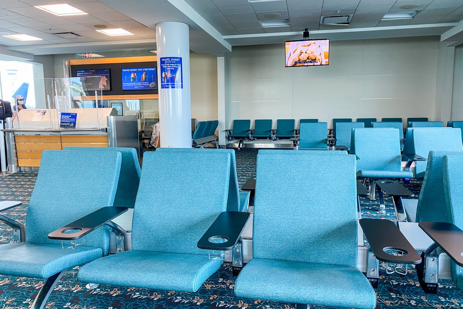 At the gate: At the Houston airport, things started off fine in the gate area as we had our own corner to ourselves. But our flight was delayed over two hours for routine maintenance that went slower than expected (staff says the holdup was due to COVID-19).