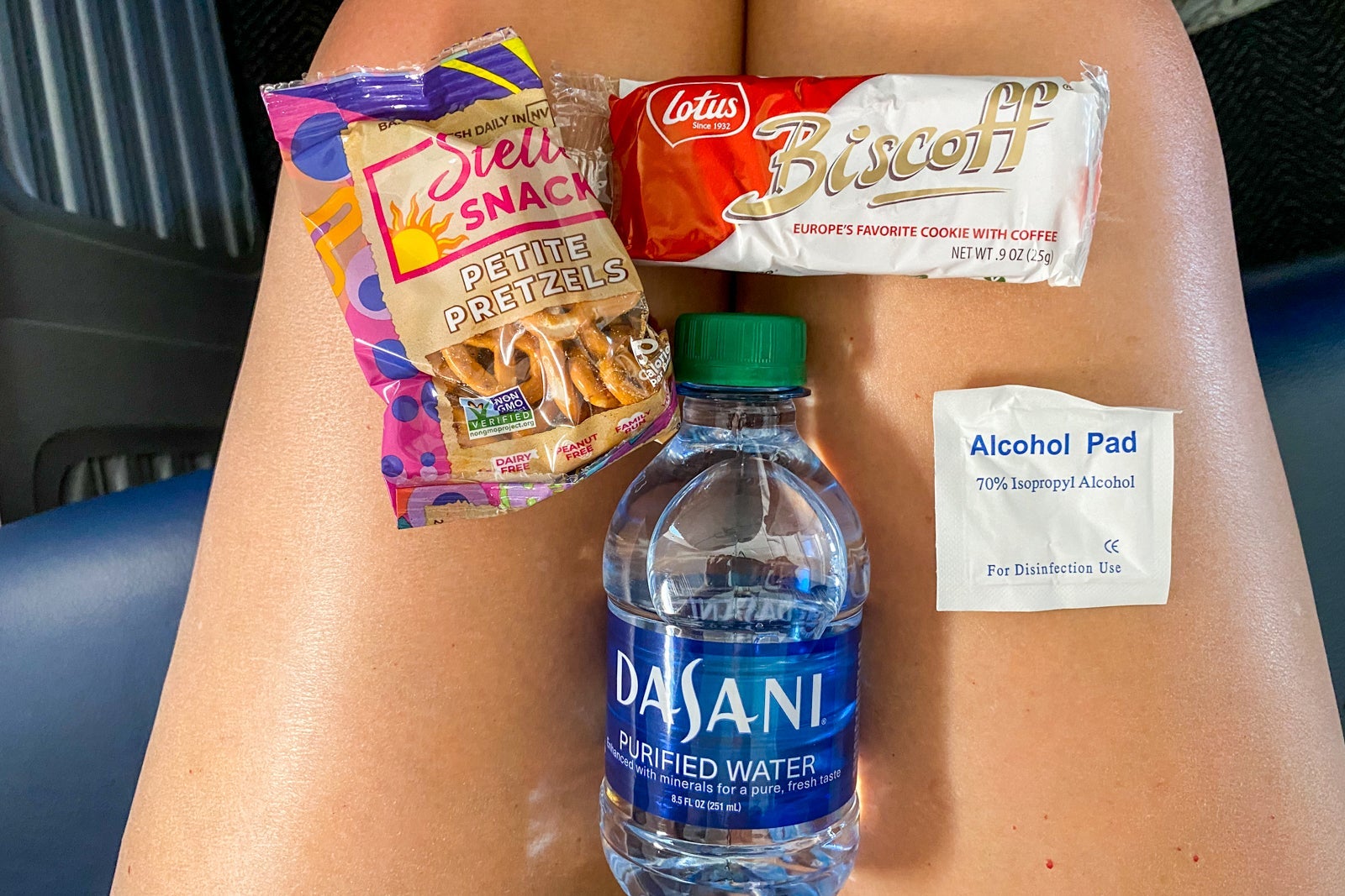 Although a small gesture, I still appreciated receiving the small bag of pretzels, a mini bottle of water and a packet of hand sanitizer. Still, I was never offered any disinfecting wipes.