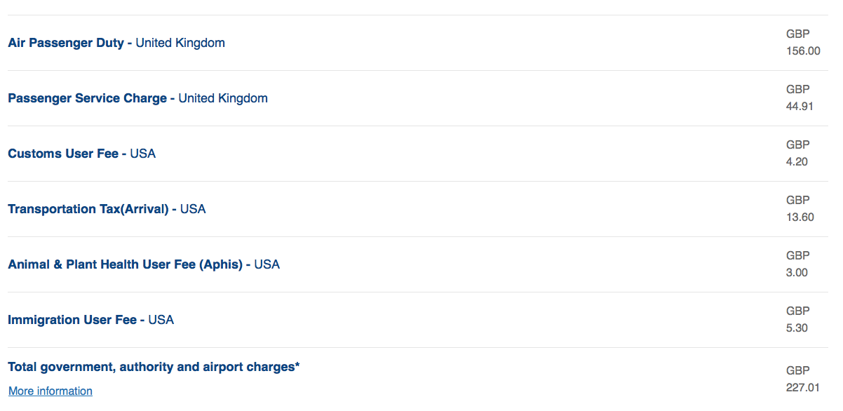 A quick example of how much the current APD tax makes up of a business class ticket with British Airways from London (LHR) to Los Angeles (LAX) can be seen below. At 156 GBP ($208) it's by far the biggest tax or fee on the ticket.