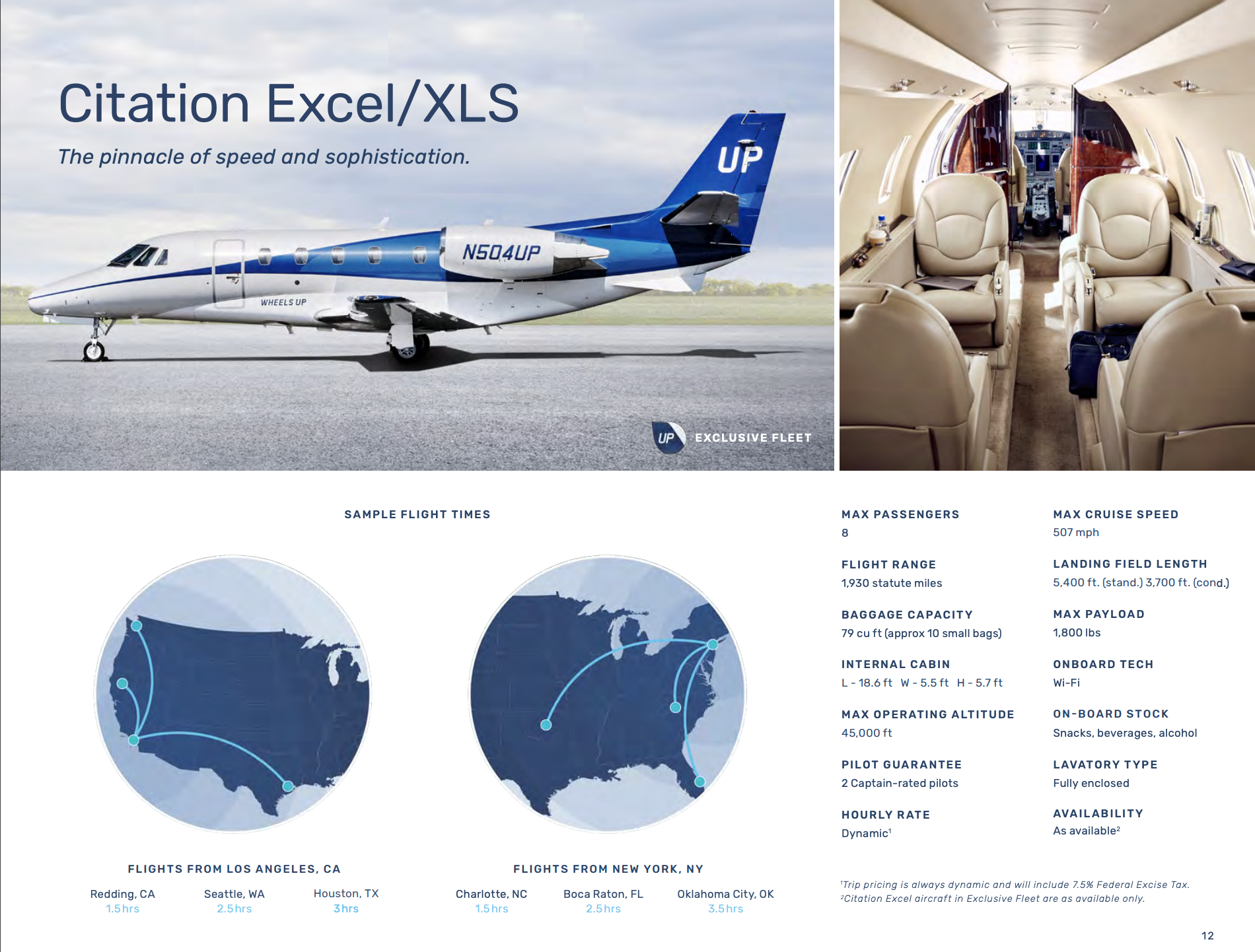 The Wheels Up membership guide provides details about each type of plane, including the number of passengers it can accomodate, luggage capacity, maximum range and some sample routes.