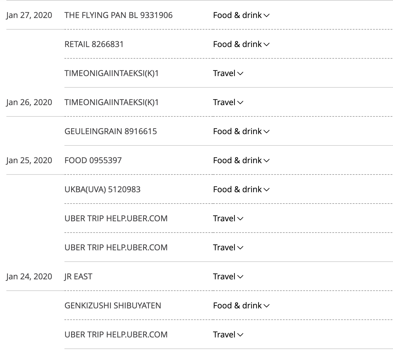 One of Chase's strongest selling points is how easy it is to work with the Ultimate Rewards program, from broadly-defined bonus categories to a travel credit with almost no restrictions on the Chase Sapphire Reserve. I spend about 85% of the year outside of the U.S., and I can count on one hand the number of transactions that have not coded correctly with my Sapphire Reserve. Just as an example, here's a screenshot of my statement from a recent trip to Japan and Seoul, showing all the purchases code correctly as either dining or travel:
