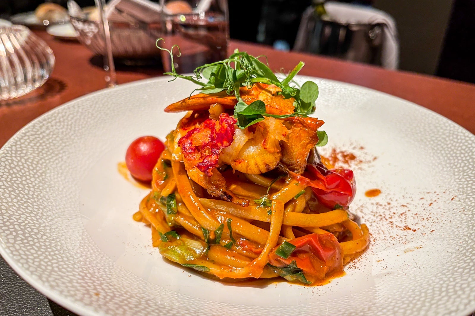 The Amaranto Restaurant is a stunning eatery just off the hotel's lobby and aptly named Amaranto Lounge. With a rotating menu curated by Executive Chef Henry Brosi, guests can expect a colorful and tasty culinary journey. I opted for the burrata with heirloom tomatoes as a starter, which featured a creamy burrata and a sweet, yet smoky taste from balsamic pearls and a touch of honey. For my main, I got the lobster linguine, which is served in a spicy shellfish sauce — a full-senses experience.