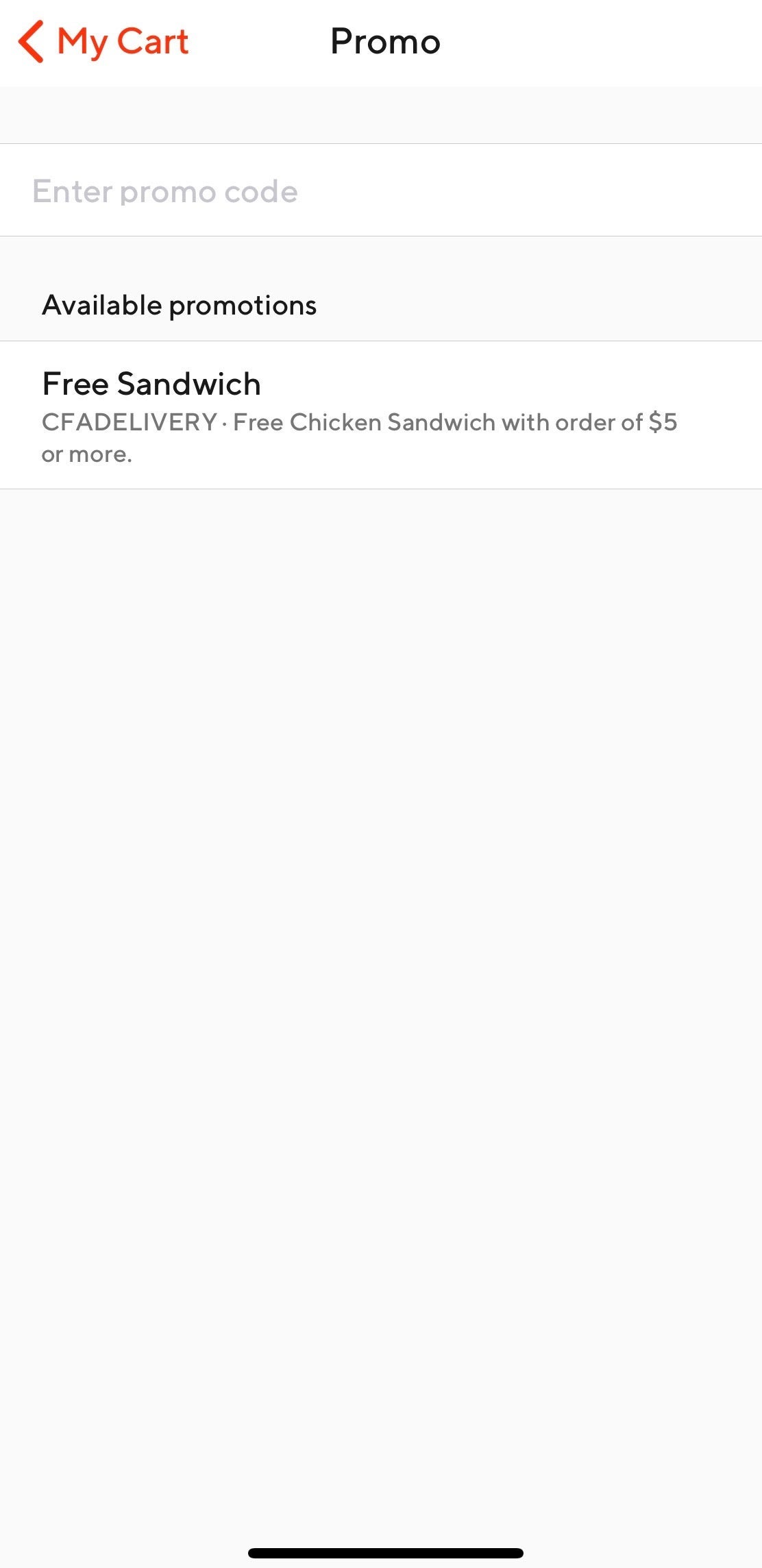 To be eligible to receive your free chicken sandwich, your delivery location needs to be within a 10-minute drive of a Chick-fil-A store. The company set that requirement to make sure you'll get a hot, fresh meal delivered to you -- nobody wants cold, soggy chicken. To order, Log in to DoorDash and search for a Chick-fil-A in your area. If there's one nearby, order yourself a chicken sandwich (I'd add some of their awesome waffle fries with a side of Chick-fil-A sauce) and apply the promo code CFADELIVERY at checkout on an order of $5 or more after 10:30am. There will be a delivery fee, which is currently displaying as $1 in our test.