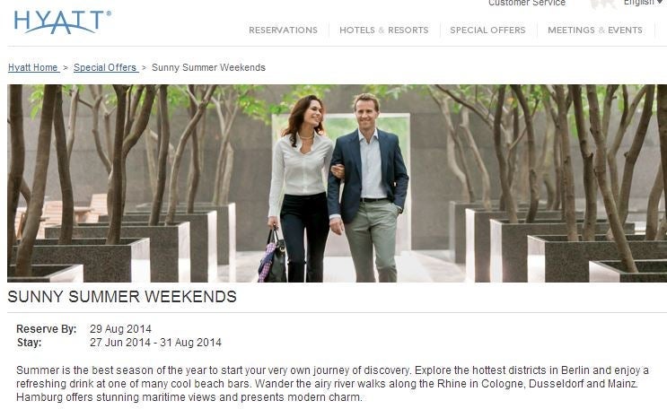 15% Off Summer Hyatt Stays in Germany: Get 15% off with Hyatt's "Sunny Summer Weekends" promotion for hotel stays between June 27 and August 31, 2014 in Germany. Free breakfast, WiFi and use of spa is also included in the promotion. You must arrive on a Friday or Saturday and stay a minimum of two nights. Make sure to enter the promo code "SUMMER" during checkout to receive the discounted price. Book before August 29, 2014. The participating properties are listed below: