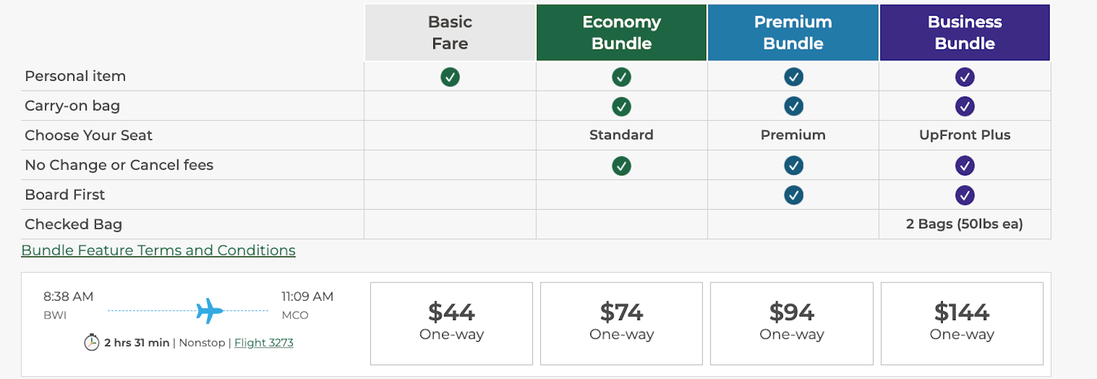 Here's how the fares shake out on an overall cheaper one-way flight from Baltimore/Washington International Thurgood Marshall Airport (BWI) to Orlando International Airport (MCO). Prices start at $44 for a basic ticket, and they climb by the same increments for each class ($30 extra for Economy, another $20 for Premium and another $50 for Business).