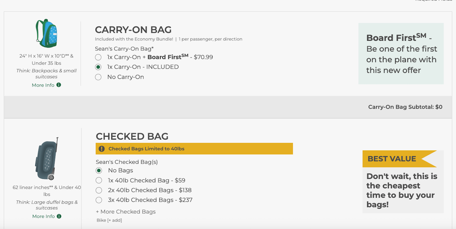 And, when it comes time to select baggage, my full-size carry-on is included (but a checked bag would start at a hefty $59).