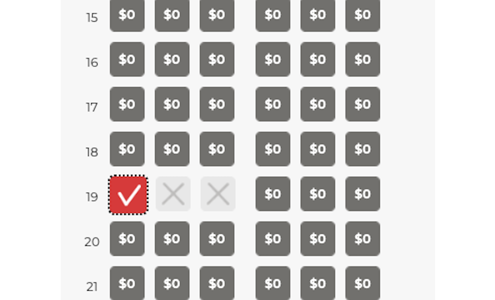 Let's say I select the $74 Economy fare for this BWI-to-Orlando flight. As you can see, when I get to seat selection, all the standard seats are marked at a cost of $0.