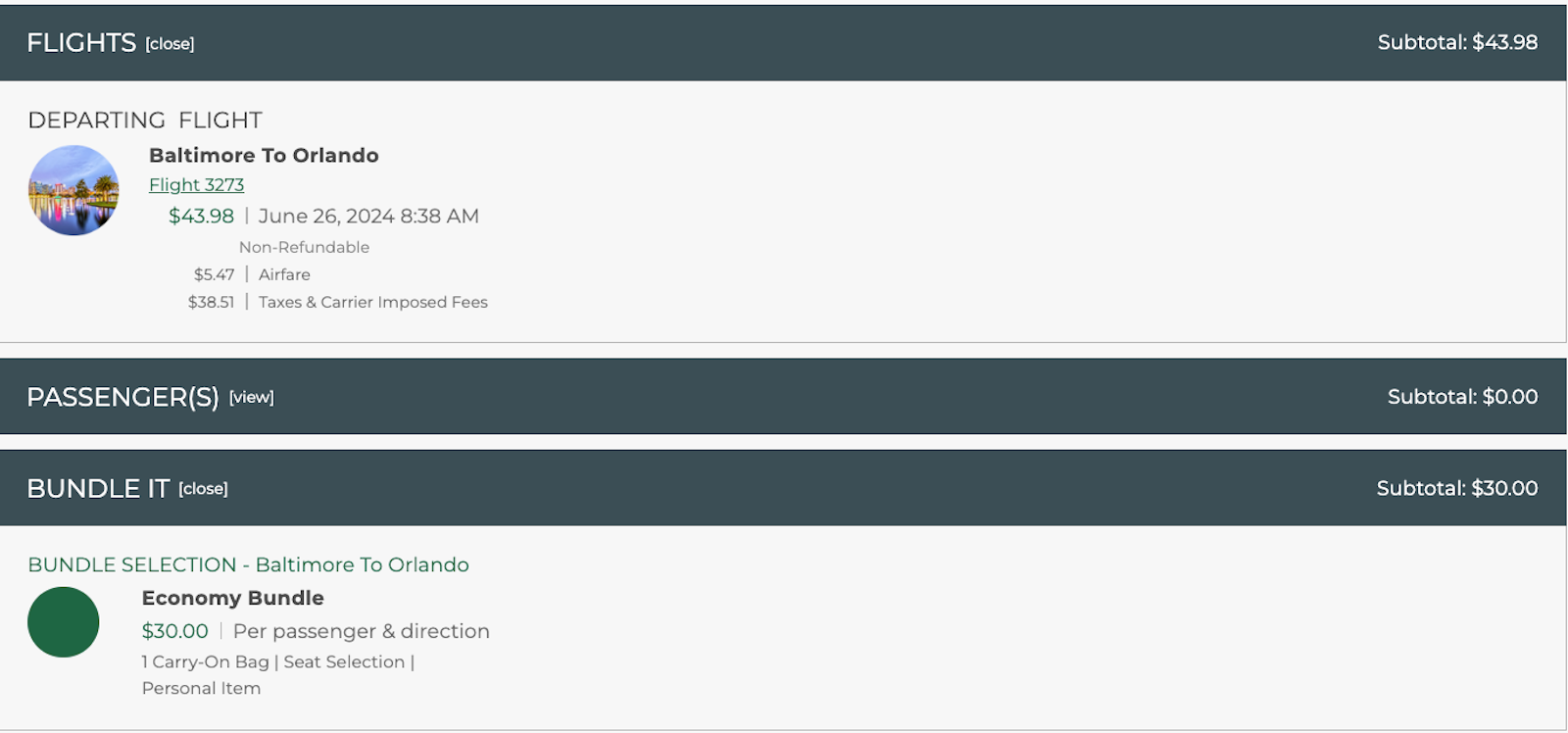 Once you go to check out, you're reminded that the airline is largely changing the presentation of its fares and add-on charges. The $74 Economy fare I selected actually consists of a $43 base fare and $30 in ancillary charges.