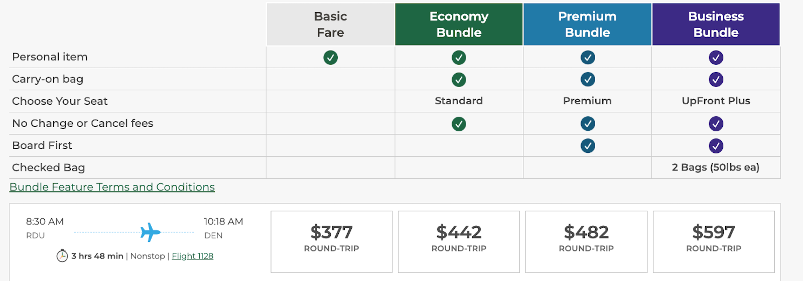You'd pay $30 more for the "Economy Bundle" class (which adds seat selection and a carry-on bag). Another $20 gets you the "Premium Bundle" with an extra legroom seat. Another $50 gets you the "Business Bundle" which includes two free checked bags, an UpFront Plus seat with extra legroom and the middle seat blocked.