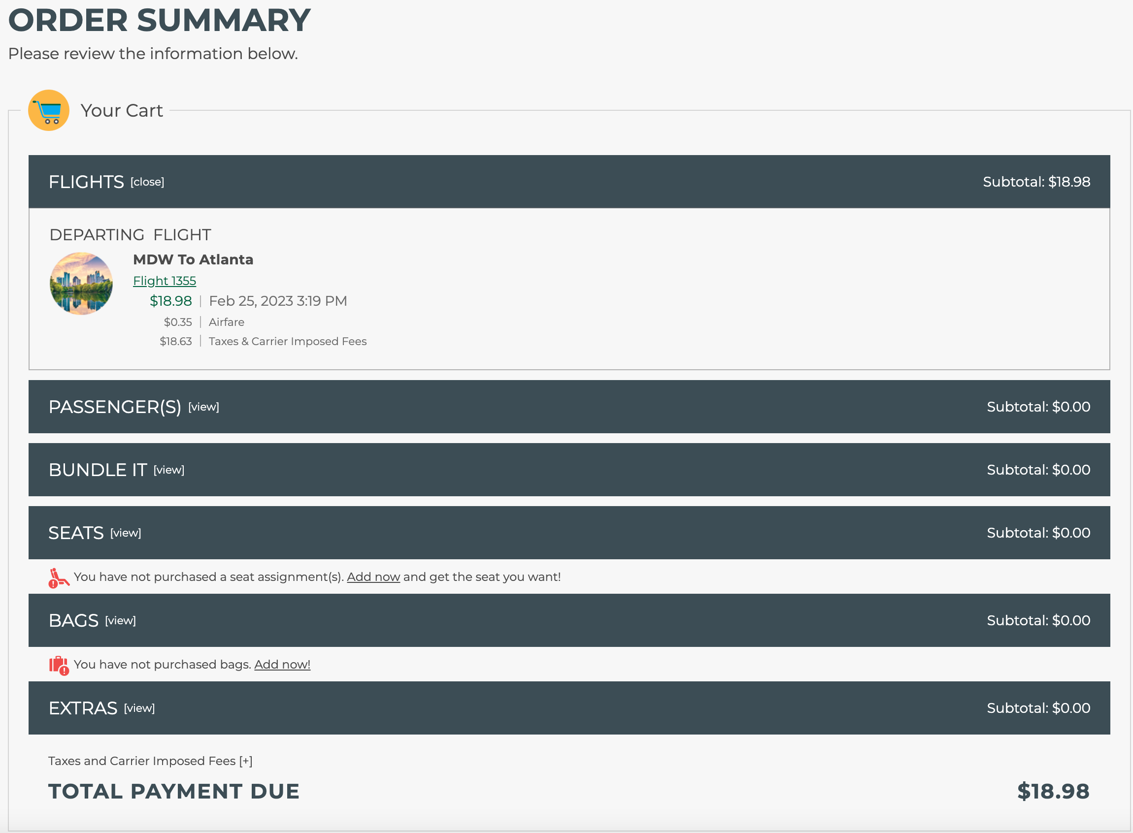 I purchased a one-way flight in February from Chicago's O'Hare International Airport (ORD) to Hartsfield-Jackson Atlanta International Airport (ATL) for $19 for the base fare only; I didn't select seats or add baggage — both of which cost extra with Frontier.