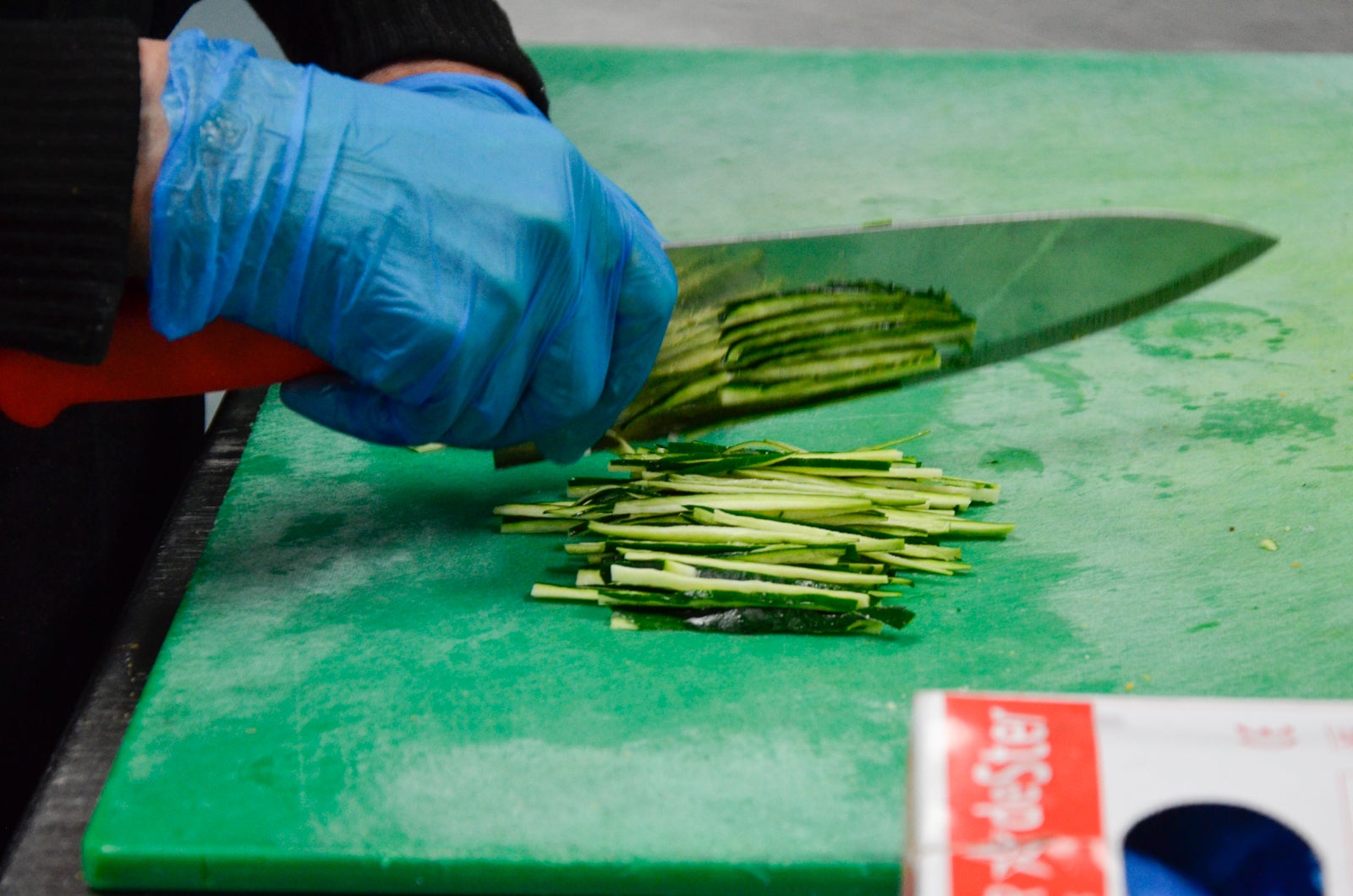 The cook grasped the blade just like Anthony Bourdain advised in Kitchen Confidential — not by the handle but on the blade itself.