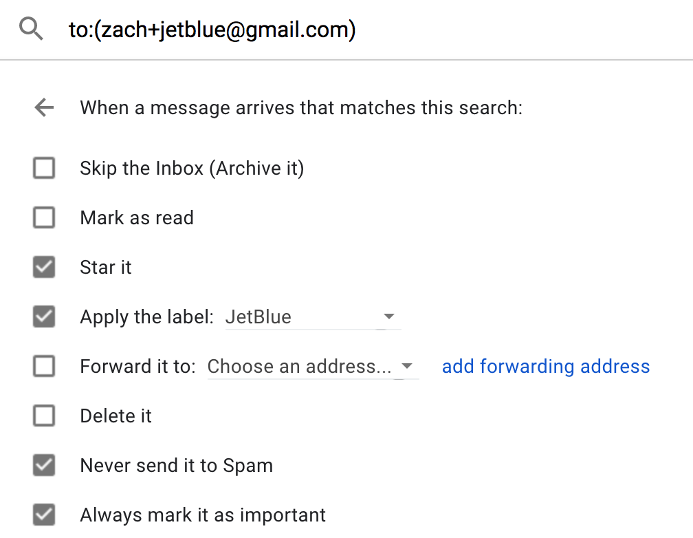 But wait — there's more! You can easily create filters based on these addresses. zach+john goes into a folder for little John's emails, while emails sent to zach+italy get a special flag during the weeks leading up to my trip. Then, when I get back, I can change the settings to immediately mark those emails as read, or to keep them out of my main feed, so any post-trip promos and follow-ups don't clog up my inbox.