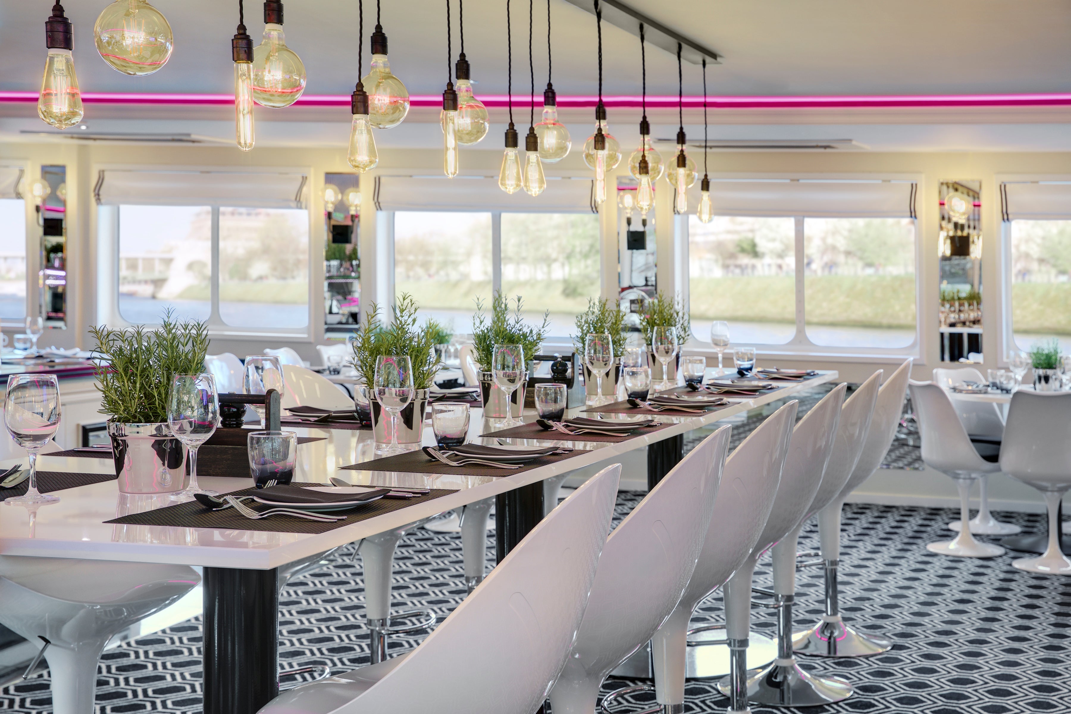 U by Uniworld's ships boast sleek, matte black exteriors; onboard mixologists and DJs; deck-top yoga; and communal tables for dining. Accommodations include studio bedrooms, some of which hold up to three people.