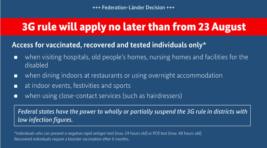 Dubbed the "3G rule," select institutions and recreational facilities are now enforcing proof of vaccination or a recent negative COVID-19 test for patrons wishing to enter, per the German government. Affected areas include fitness studios, hotels, cafes and restaurants.