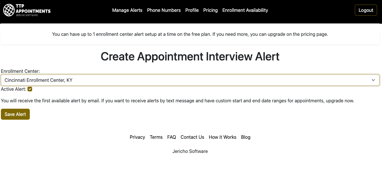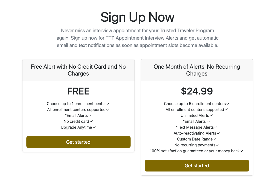 TTP Appointments offers two services: a free plan and a paid plan. With the free version, you can sign up to receive email alerts from one Global Entry enrollment center. With the paid version ($24.99 per month), you can receive text and email alerts from up to five Global Entry enrollment centers and set custom date-range parameters if you are looking for an appointment within a certain time period.