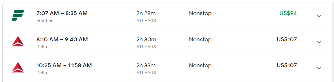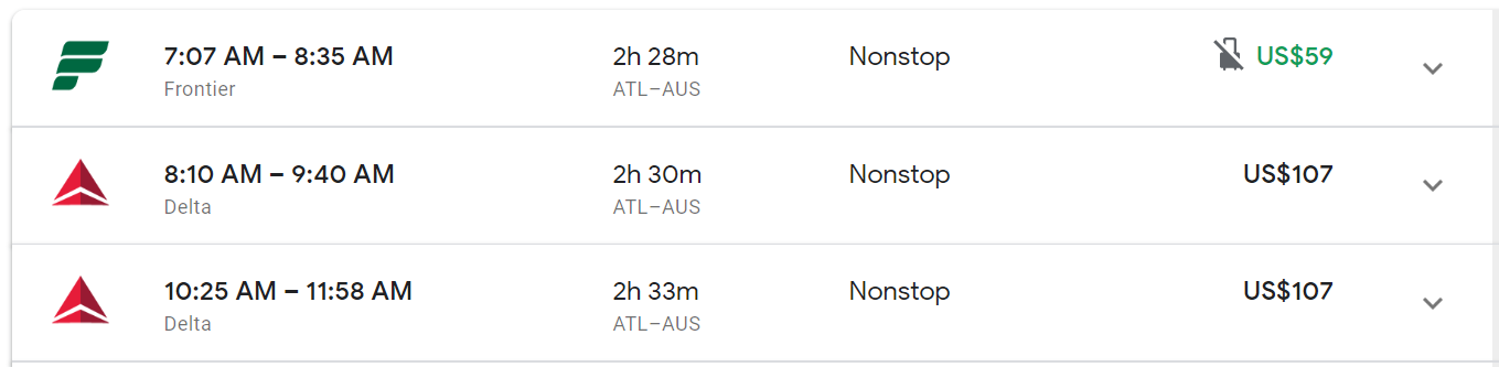 Take for example Delta's battle with Frontier on the route between Atlanta (ATL) and Austin (AUS). If you just search flight prices, Frontier looks like it's a much cheaper option.