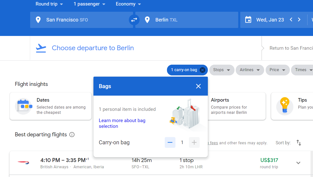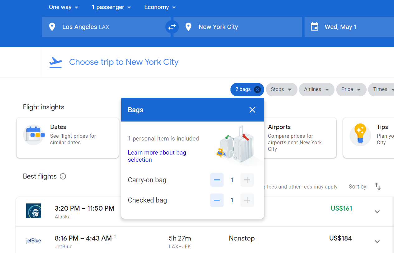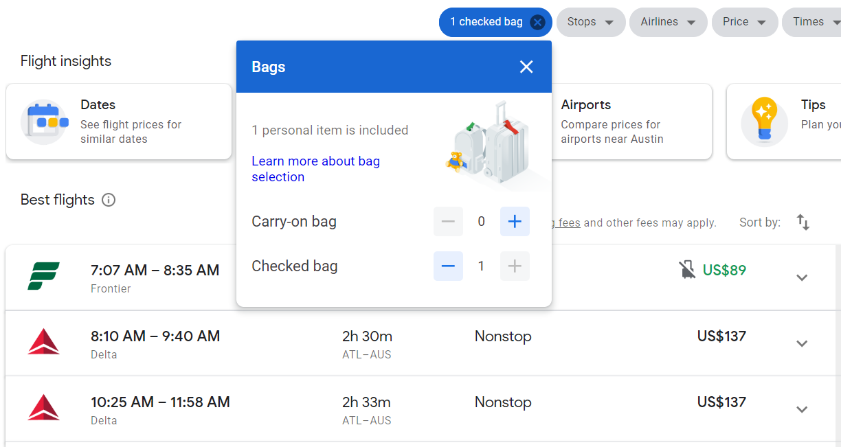 Now, Google Flights is back with another bag-fee feature to help travelers figure out the true cost of their flight: checked bag costs. If you want or need to check a bag, you can now factor the price you see in the Google Flights search results just like you could with carry-on bags.