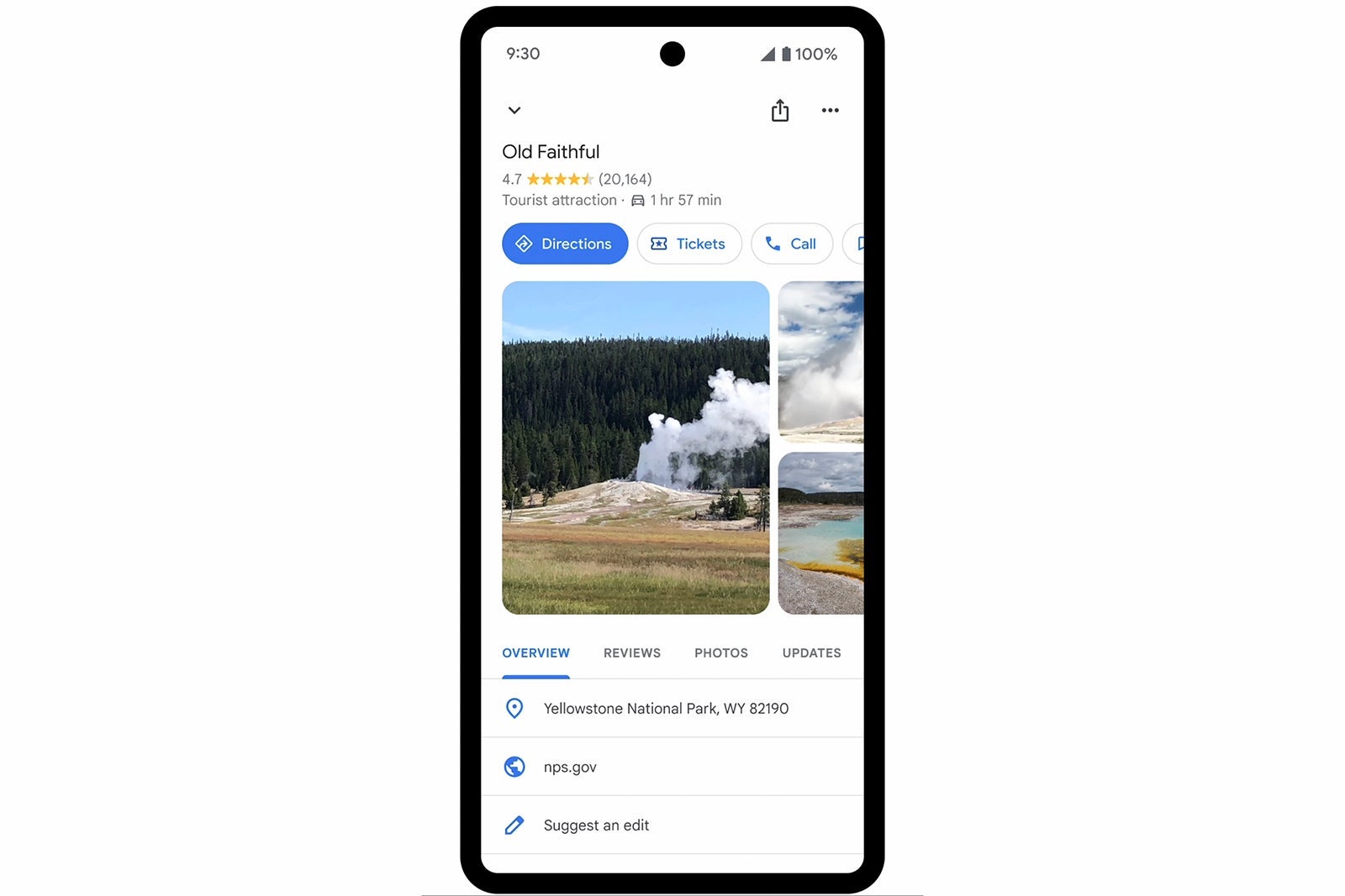 For example, if you search for Yellowstone National Park in Google Maps, it will present you with details on the park's most popular attractions, including user-generated information from travelers who have already been there.