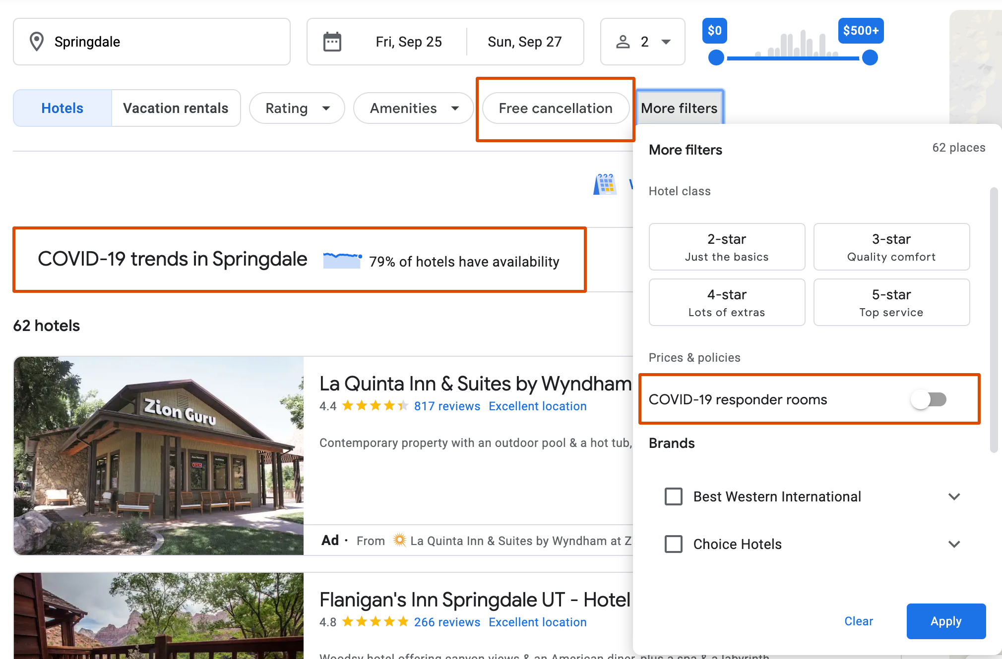 This search told me that 79% of rooms were available and I could filter and toggle by COVID-19 responder rooms and hotels that had a free cancellation policy.