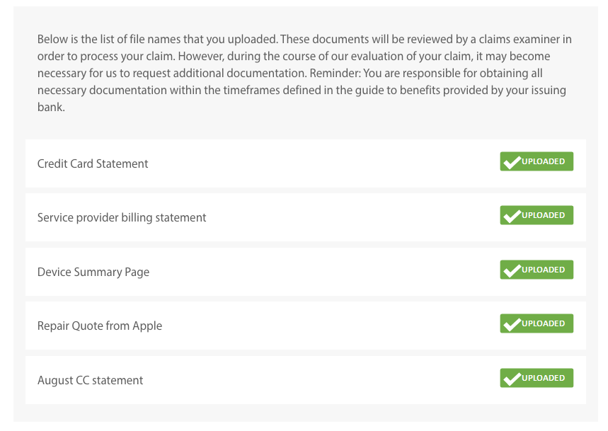 The website asked for some basic details, including the phone's make and model, serial number and date of purchase. I was then asked to upload some supporting documentation including recent credit card and Verizon statements, a screenshot of my online Verizon account showing the device associated with the account and a repair estimate.
