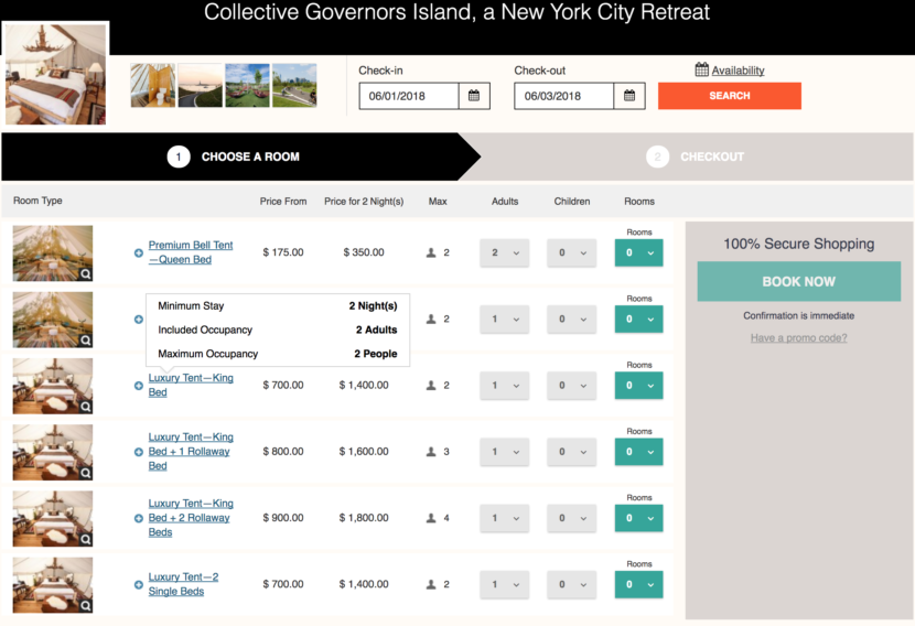 First, that $75 rate at Collective Governors Island is only available for New Yorkers, only on select weeknights and in limited quantity. Oh yeah, and you won't be staying in a hotel — you're paying $75 for a luxury tent, which actually doesn't look half-bad. But that tent is located on Governors Island — which, while technically in the borough of Manhattan, is actually located in the middle of New York Harbor. Getting to and from your accommodations requires taking a short ferry, available between the hours of 10:00am and 5:30pm Monday-Friday, and until 6pm on the weekend.