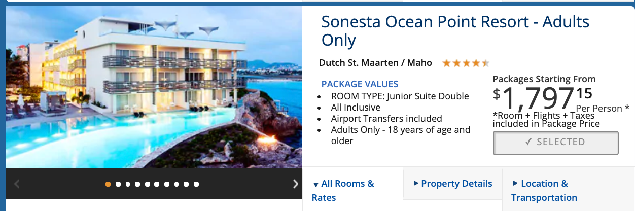 The Sonesta Ocean Point Resort is an adults-only, all-inclusive destination that also includes airport transfers. On our example dates, nonstop flights from Atlanta and four nights in a Junior King Suite at the resort for two adults would cost 179,715 SkyMiles: