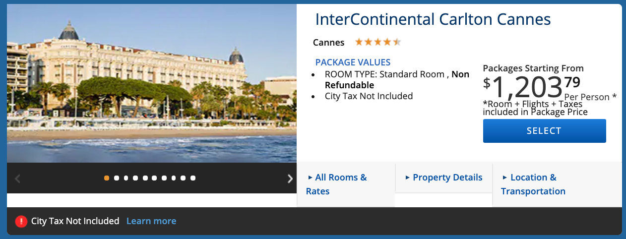 Nonstop flights from New York (JFK) to Nice (NCE) and a week at the InterContinental plus a Grand Nice bus tour will set you back a mere 120,350 SkyMiles for two adults. The beachfront property in Cannes puts the entire French Riviera within reach, with Nice a 38-minute drive away. Take a week to explore France and everything the Riviera has to offer with flights and a hotel for 120,000 miles.