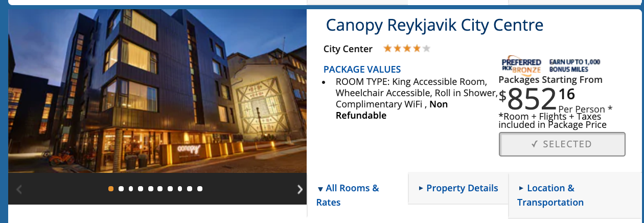 This popular destination is also an expensive one with limited hotel options. For 100,858 Delta miles, next April you could fly nonstop from New York (JFK) to Reykjavik (KEF) and spend five nights in the Canopy Reykjavik City Centre.