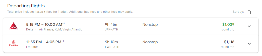 A search on Google Flights shows nonstop flights on Delta from New York-JFK to Athens (ATH) start at over $1,000 round-trip in economy for a few dates in July. Emirates flights from Newark (EWR) start around $1,100.