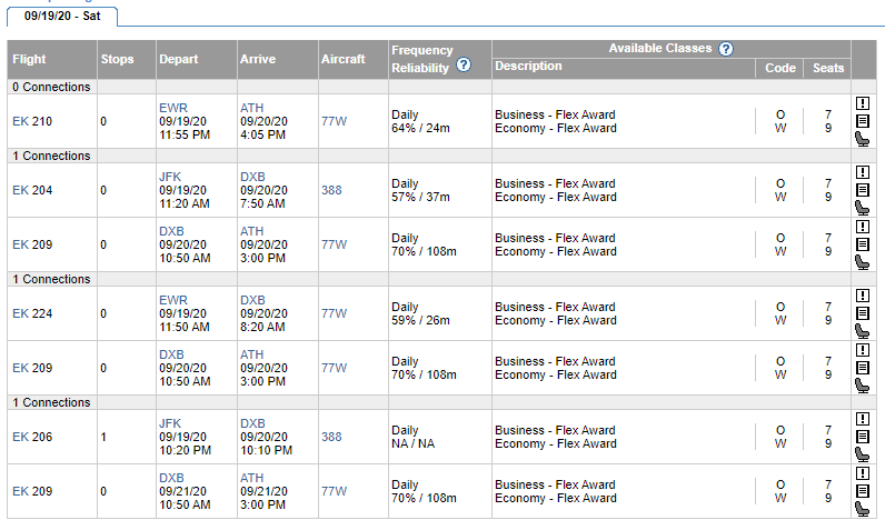 For travelers seeking nonstop award availability, there wasn't much saver space with Emirates at the time of publication, according to a search on ExpertFlyer (which is also owned by TPG's parent company, Red Ventures). There was plenty of flexible space, but we'd recommend saving your miles for a better redemption down the line. If you're willing to stop, however, you'll find plenty of saver availability with a host of airlines.