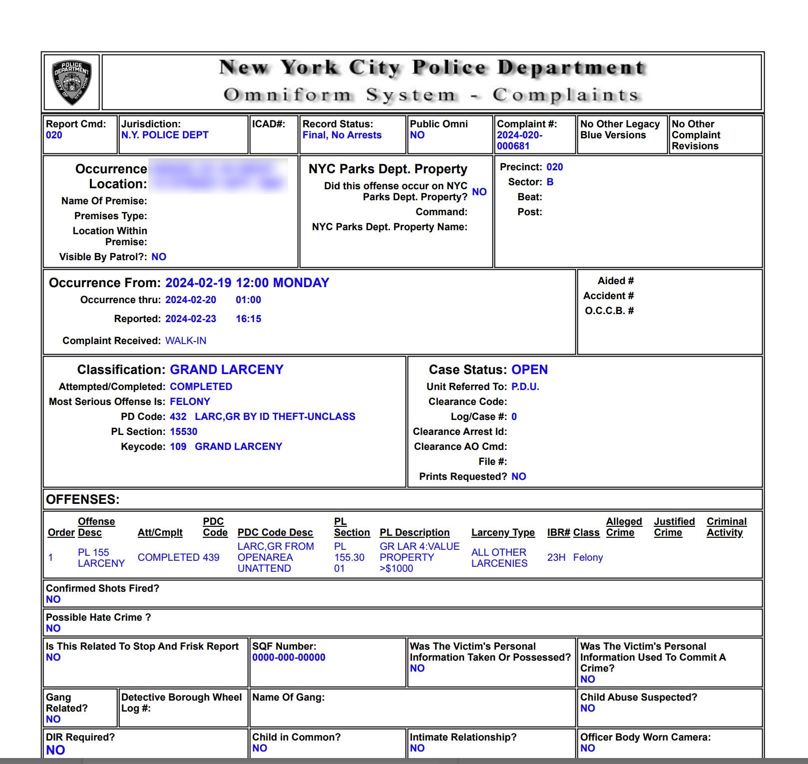 I was absolutely gobsmacked since I knew I would now have to deal with the New York City Police Department. As I researched how to file a police report, I was surprised to find that you can't currently do it online for the city. (This was an option at one point, but it's currently disabled.)