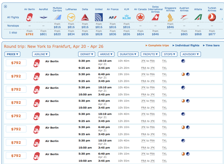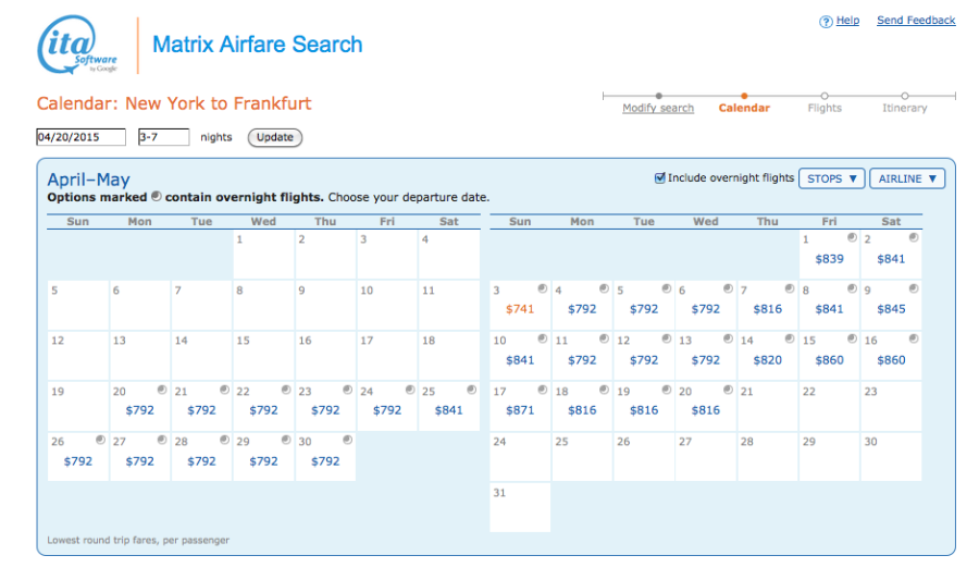 For a quick example, here is a calendar of availbility in April for roundtrip flights between New York JFK and Frankfurt: