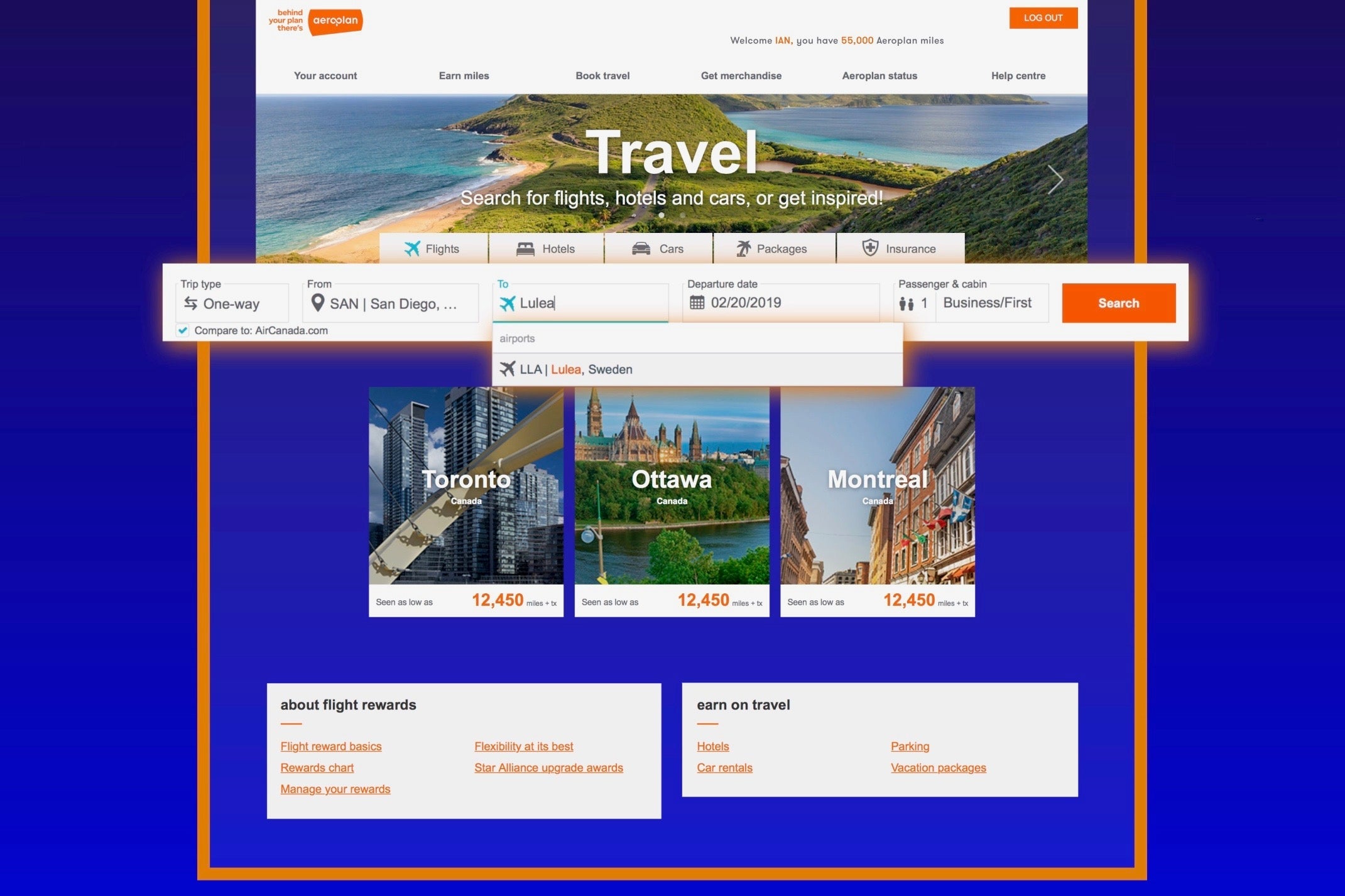 Once you have the points you need for your ticket, you'll want to begin searching for award availability. To do this, head to Aeroplan's website and sign in to your account, or create one if you don't already have one.