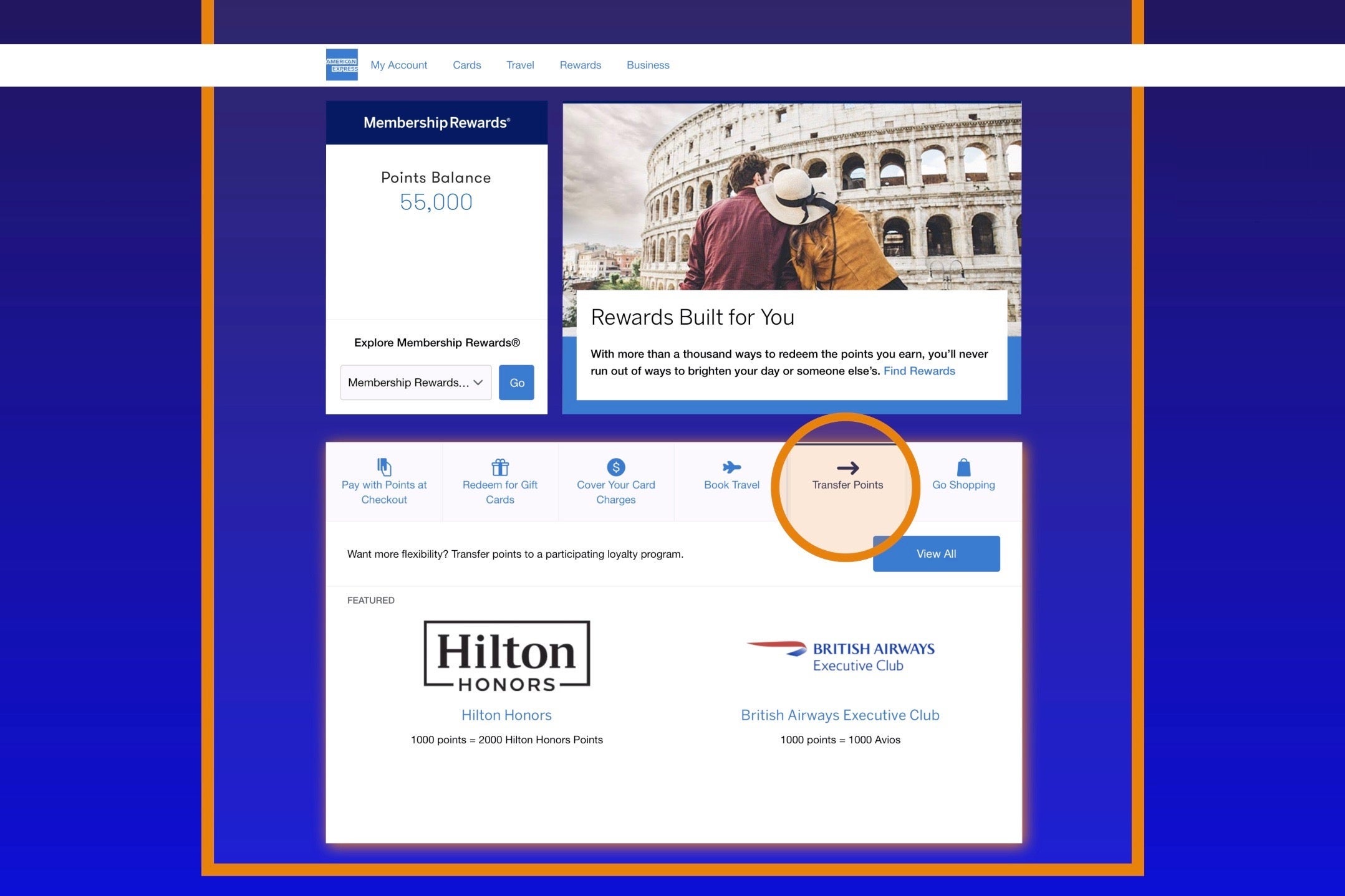 Once you've found availability on the flights you want, you'll need to transfer your points from American Express to Aeroplan. To do this, sign in to your online Amex account, go to the "Rewards" page, click "Transfer Points" and then "View All."
