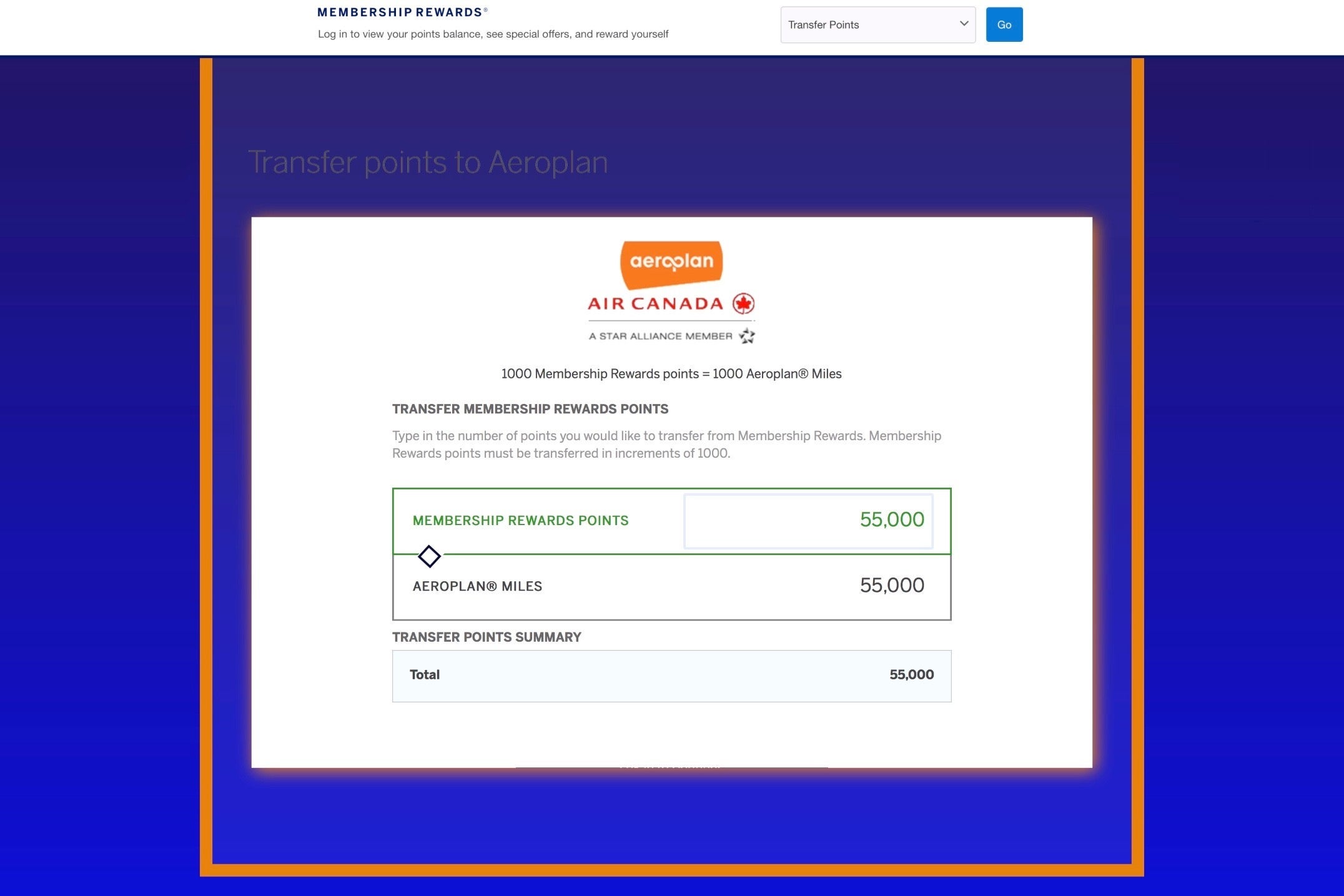 After that, enter the number of points you want to transfer (in this case, 55,000 points) and hit "Confirm & Transfer Points." Amex points transfer to Aeroplan at a 1:1 ratio and typically post instantly. The reason we searched for availability before transferring our points is because transfers are non-reversible, meaning we'd lose a lot of flexibility in our points if we didn't have immediate use for them.