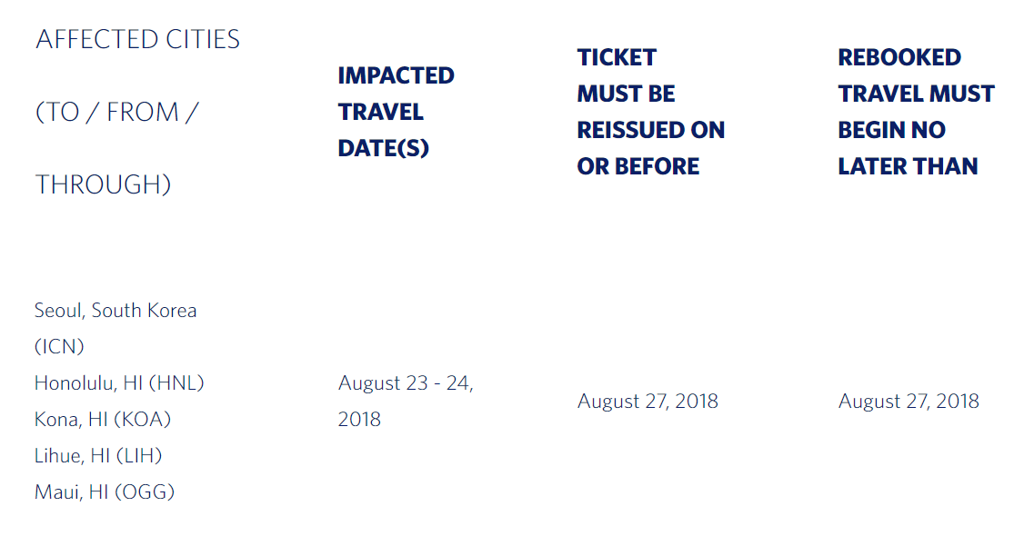 - Rebooked travel must begin no later than: August 27 (previously was August 30)